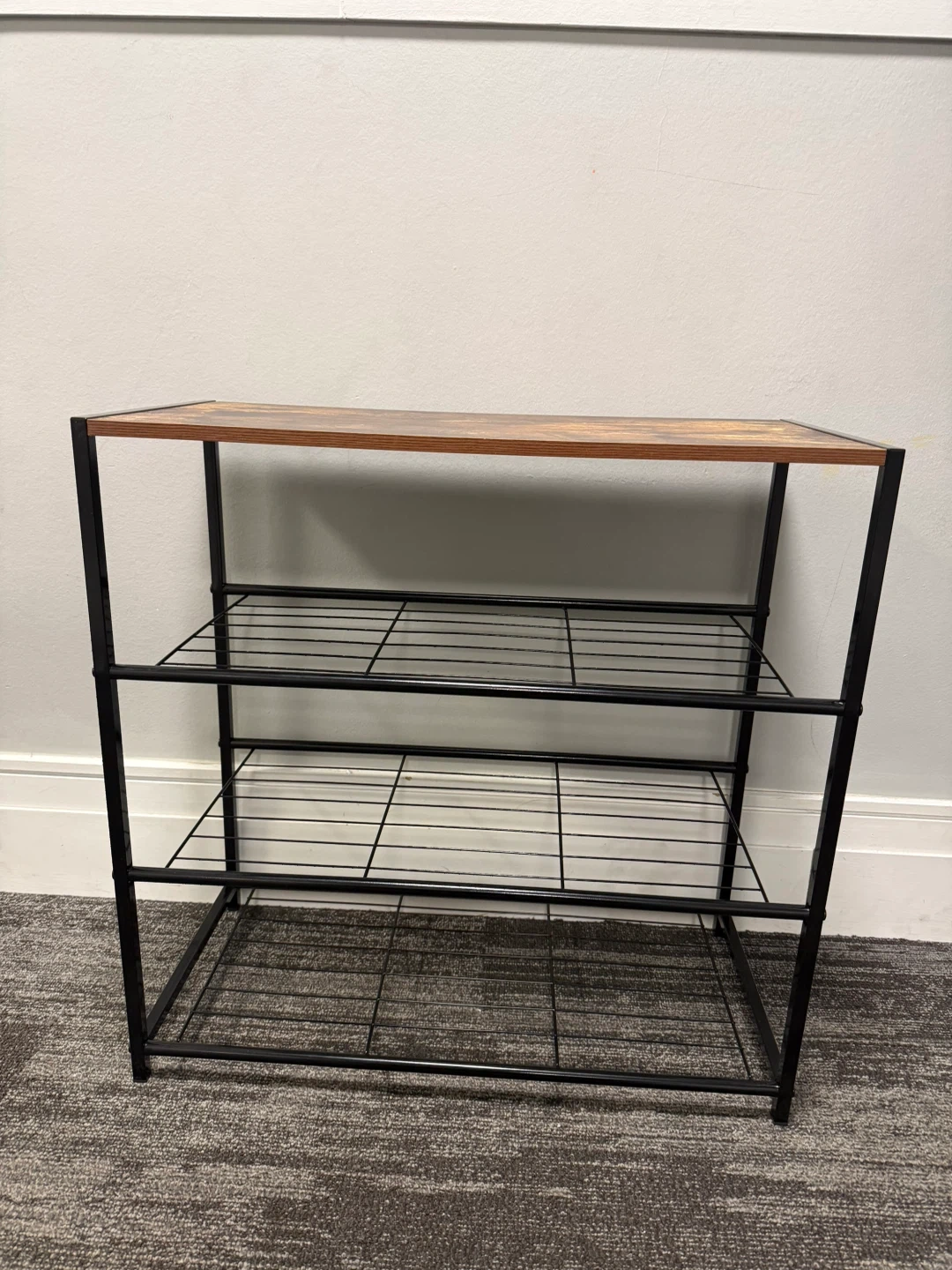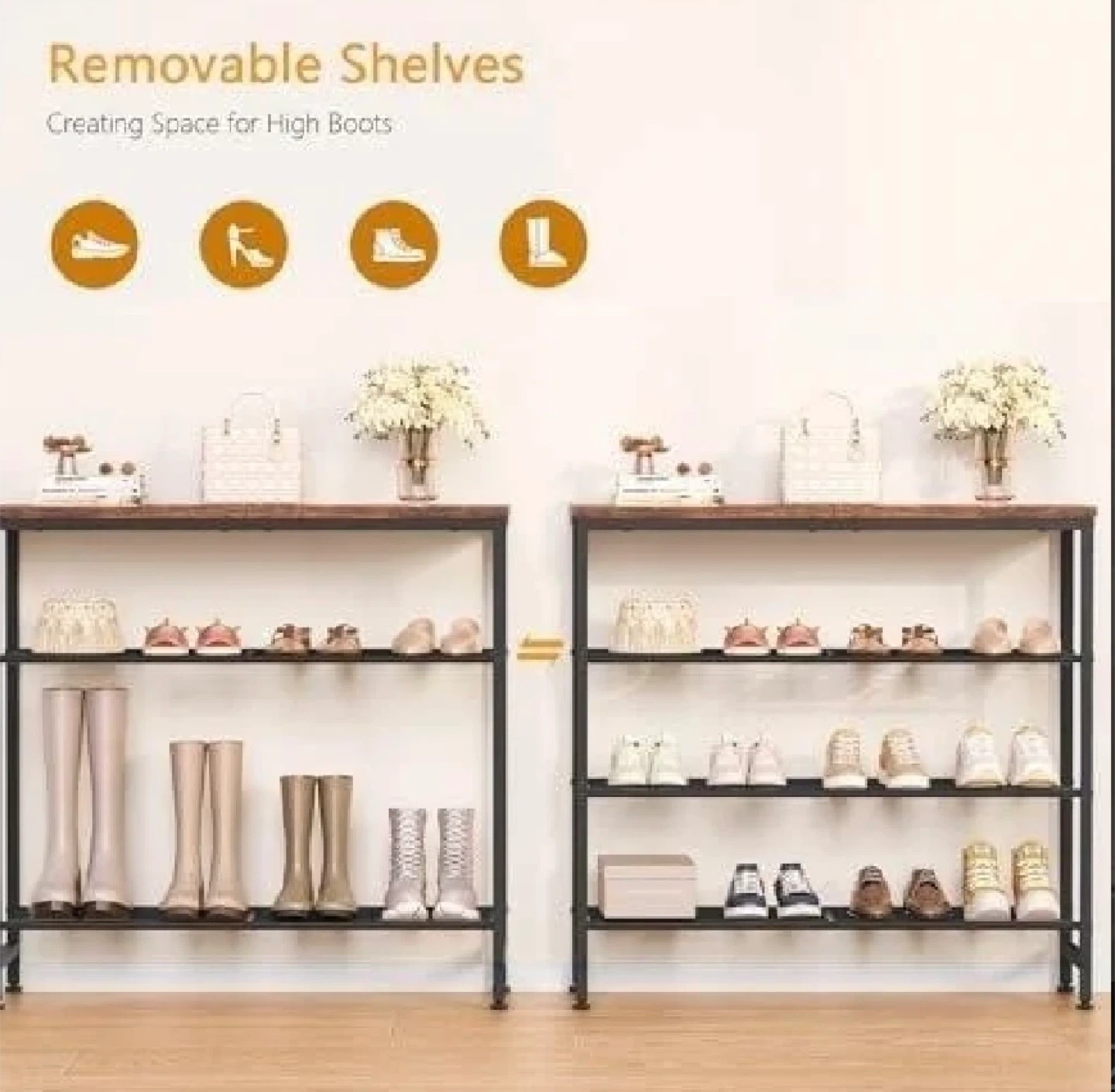 This new in box 4-tier industrial shoe rack, perfect for organizing your footwear with style. This sturdy rack features a wooden top and metal frame, providing a rustic yet modern look to any entryway or closet. It has a 4-tier design to store multiple pairs of shoes, or can be used for other decorative storage. Get organized and add a touch of industrial flair to your home with this shoe rack! Here are some specifications: