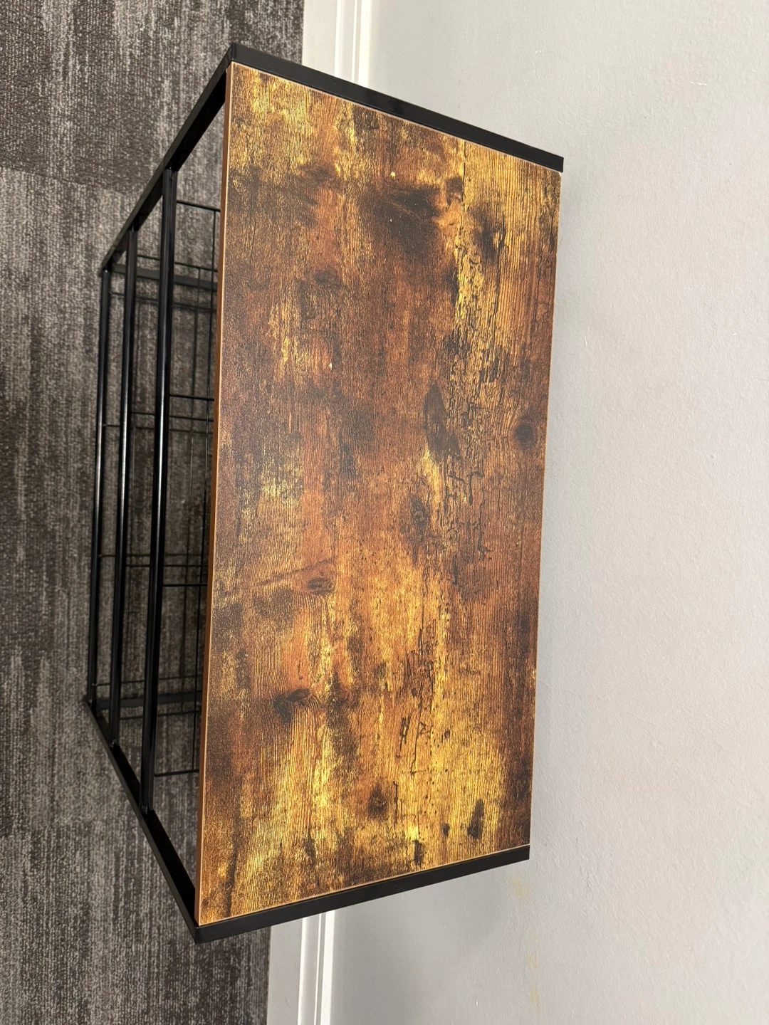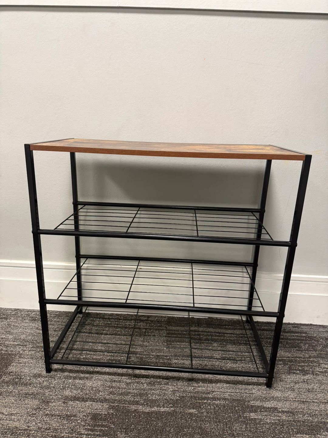 This new in box 4-tier industrial shoe rack, perfect for organizing your footwear with style. This sturdy rack features a wooden top and metal frame, providing a rustic yet modern look to any entryway or closet. It has a 4-tier design to store multiple pairs of shoes, or can be used for other decorative storage. Get organized and add a touch of industrial flair to your home with this shoe rack! Here are some specifications: