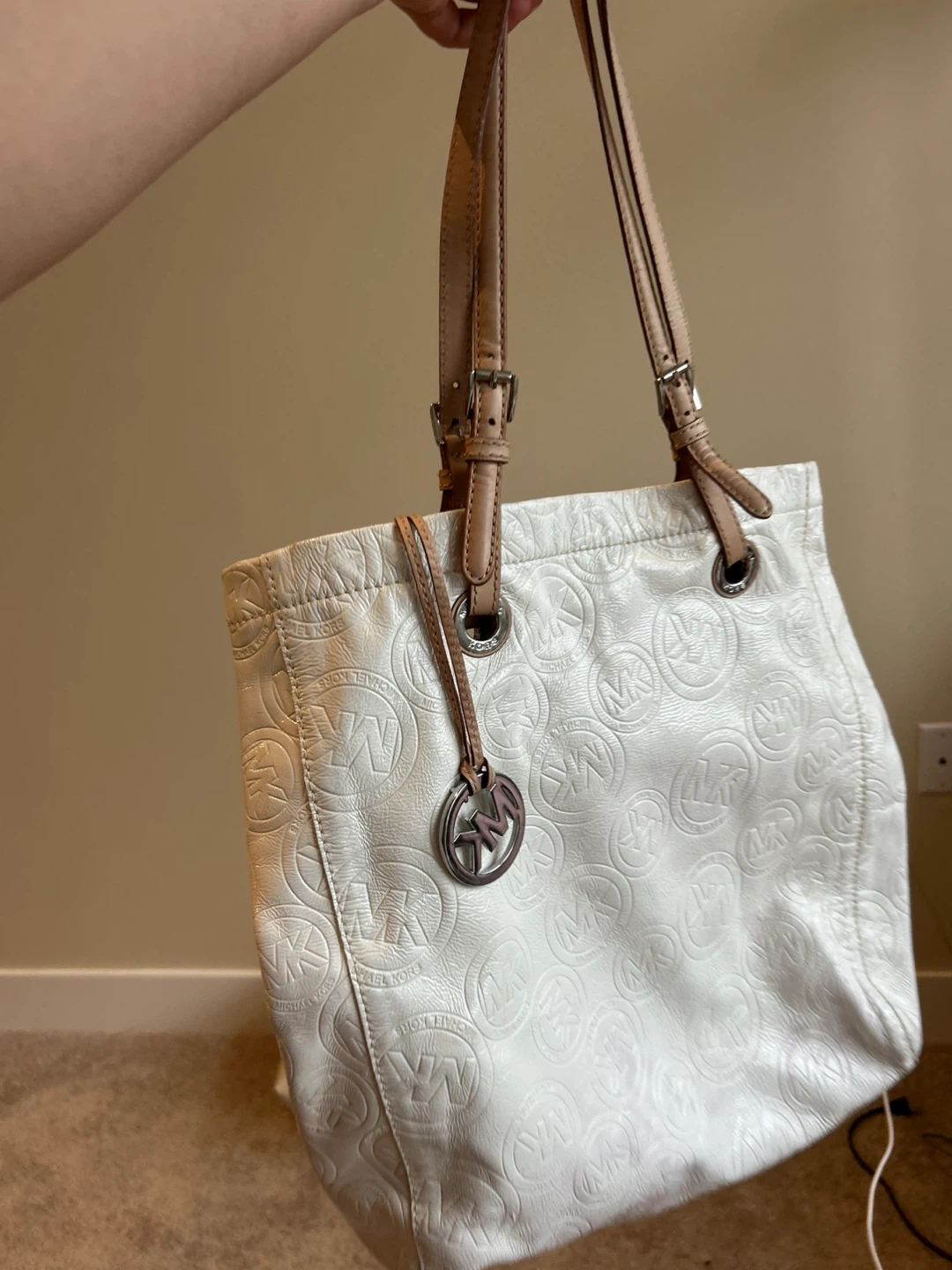 Selling a Michael Kors tote bag in white leather. It's in good condition and has a stylish design with the MK logo pattern. Perfect for everyday use!