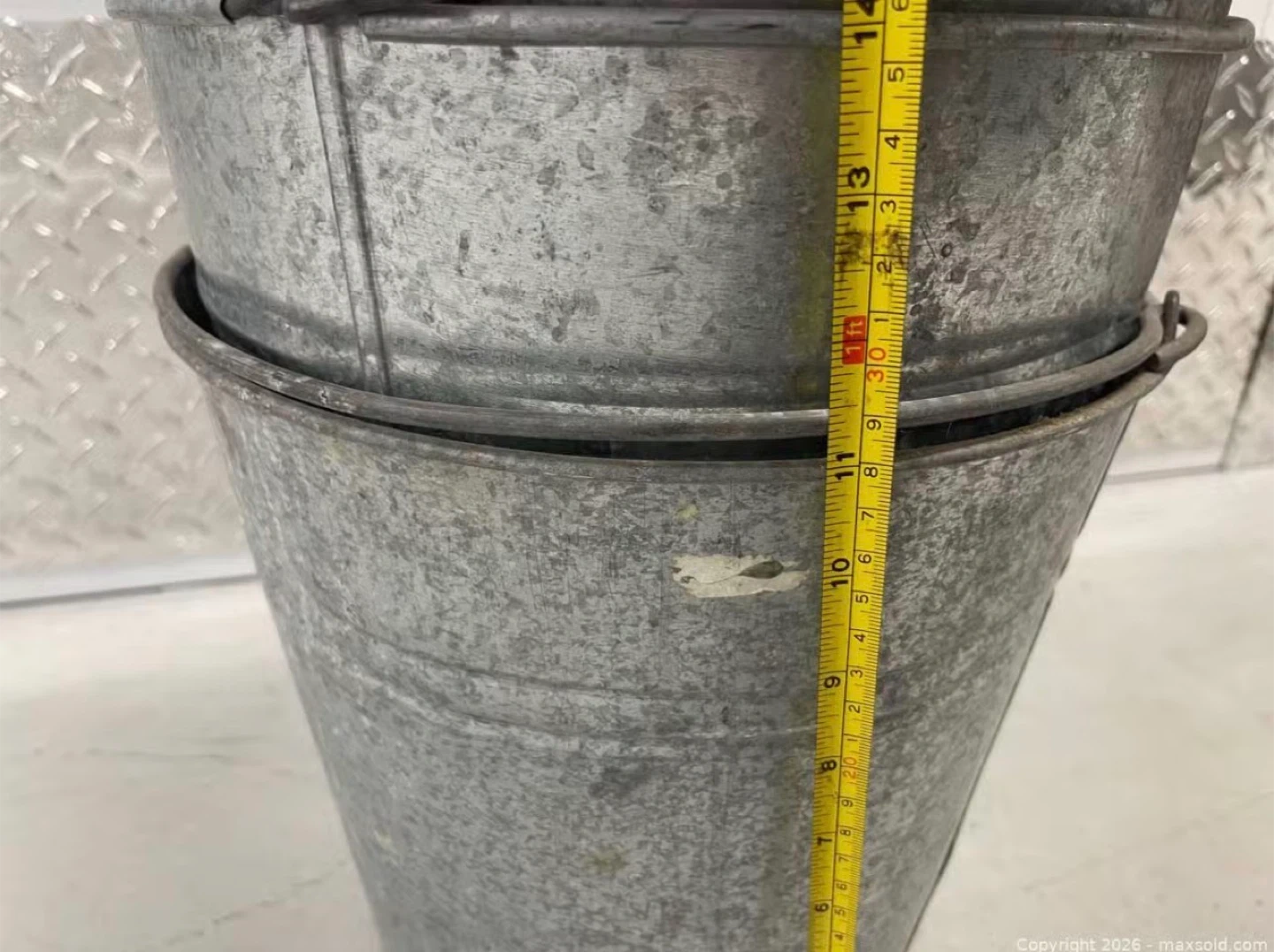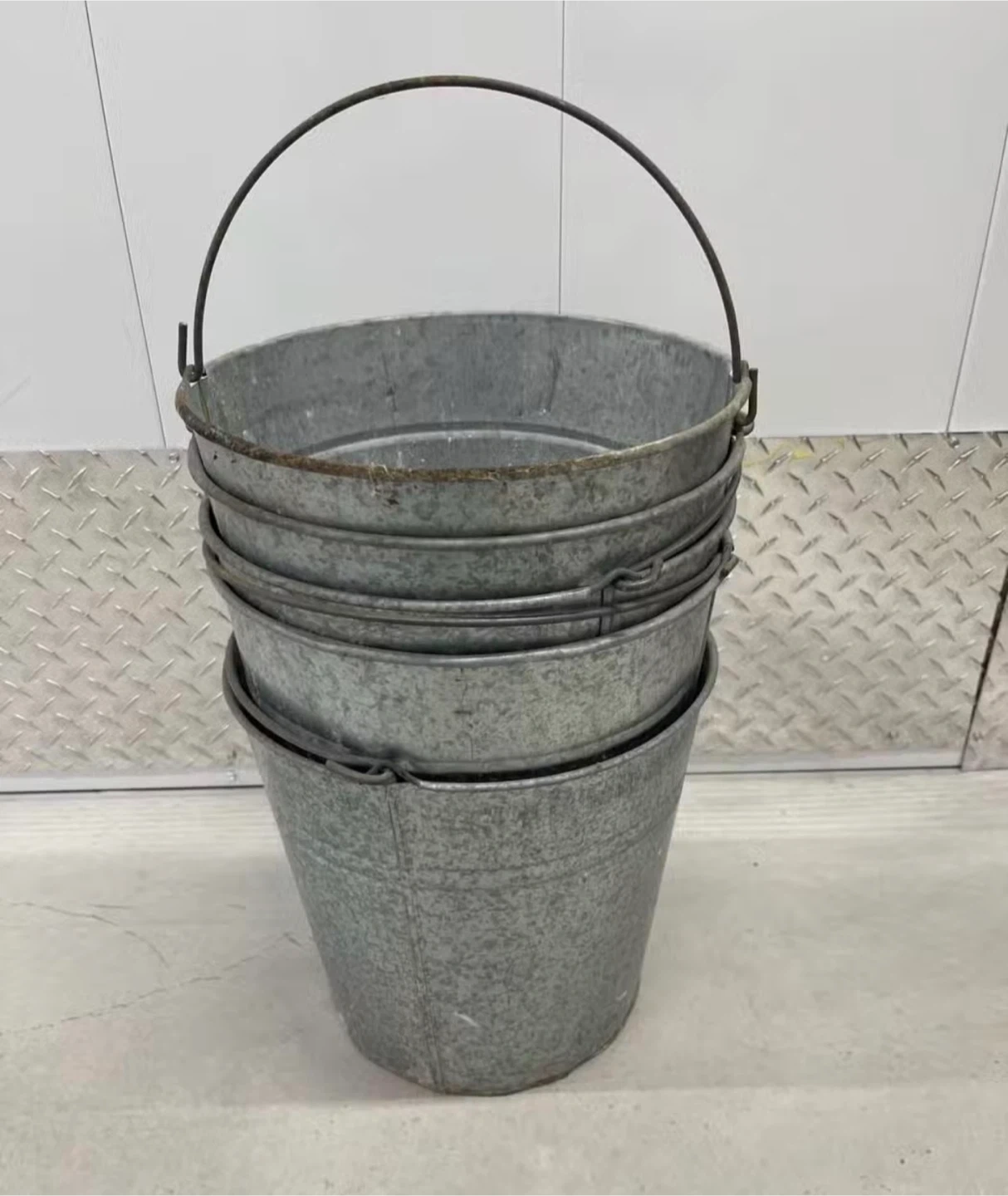 Selling a set of 5 galvanized metal buckets. They're in good condition and measure approximately 14 inches in height. Perfect for various uses around the house or garden!