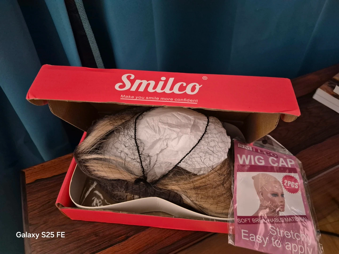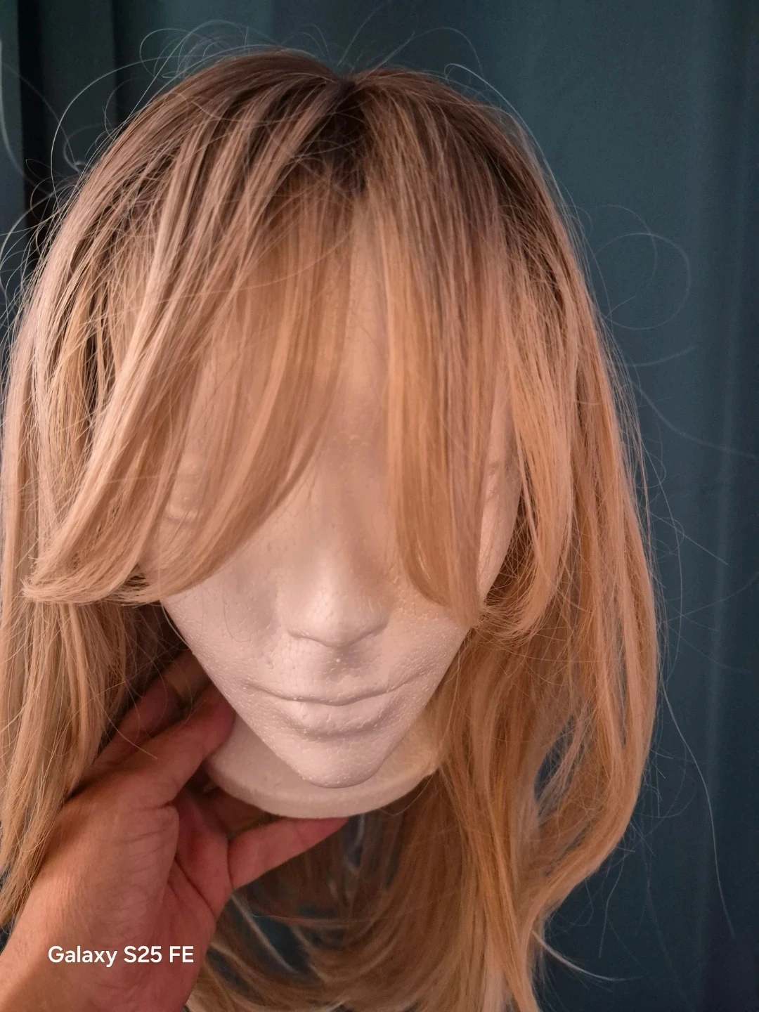 This long blonde wig features a stylish ombre effect, blending from dark roots to lighter blonde ends. It includes a full fringe for a complete look. Synthetic fibres create a natural appearance and feel.