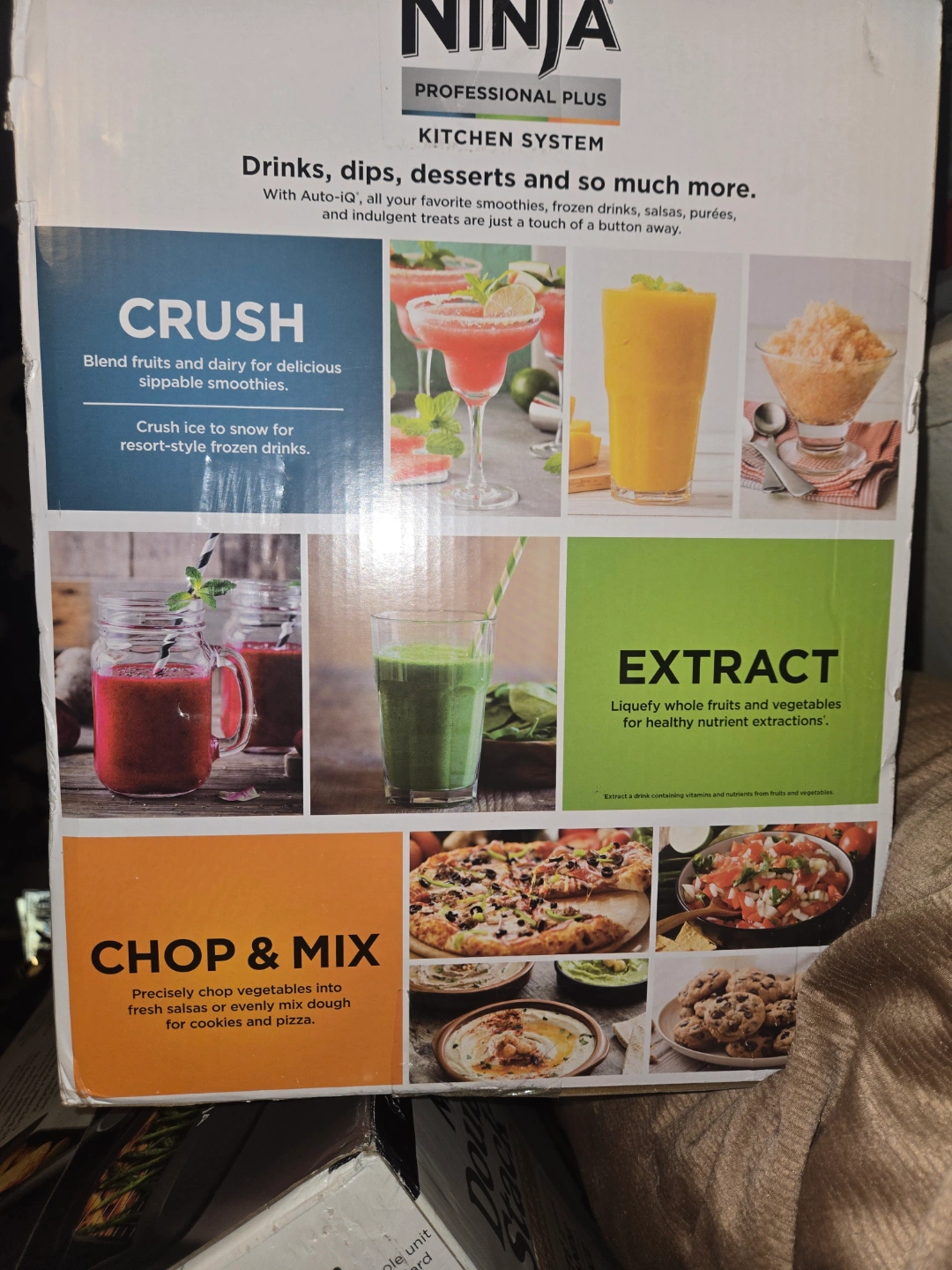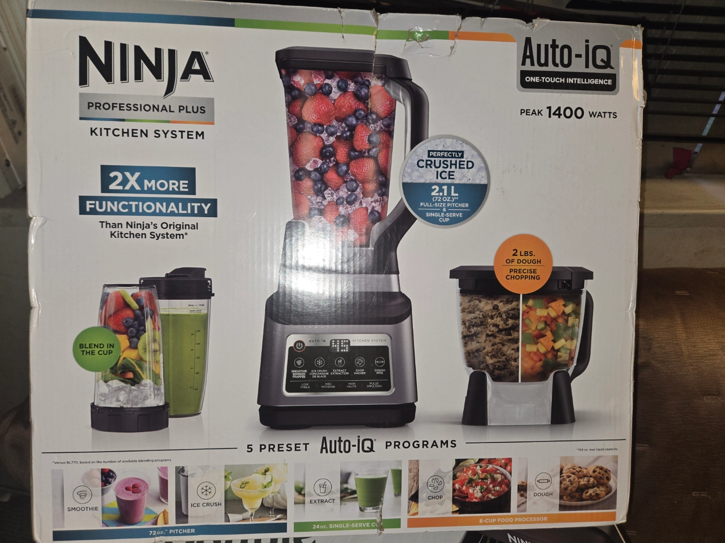Auto-iQ one-touch intelligence. Peak 1400 watts. 2x more functionality than original Ninja kitchen system. Blends, crushes, extracts, and chops. Includes multiple cups and processors. 5 preset Auto-iQ programs.