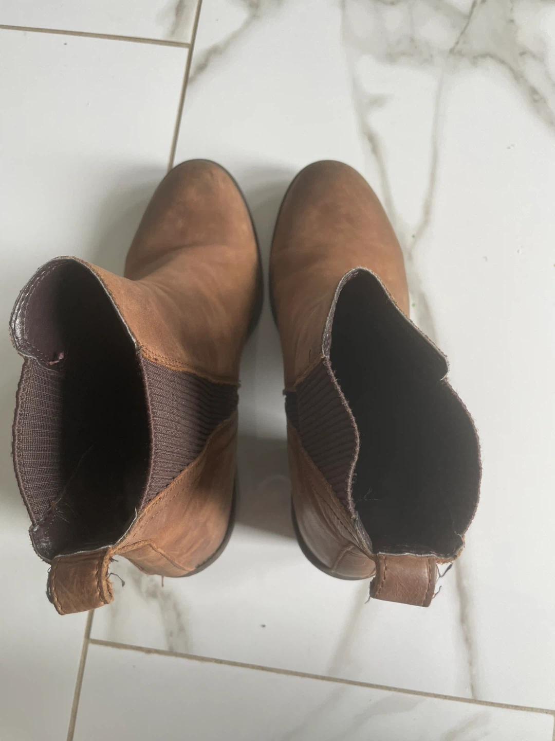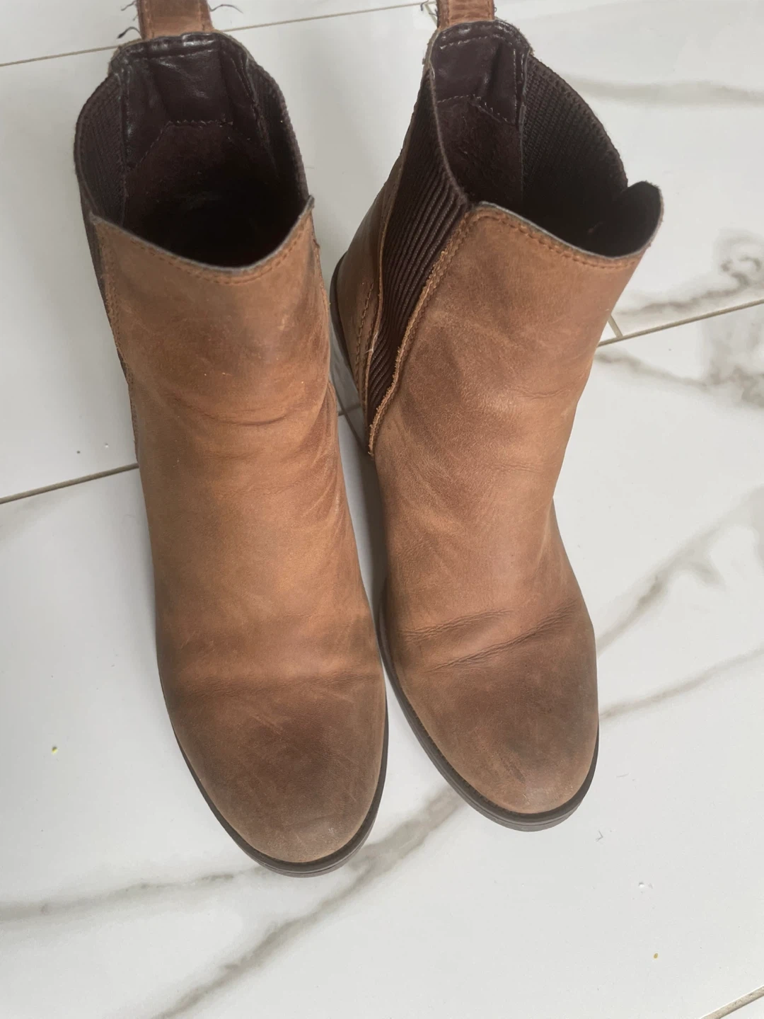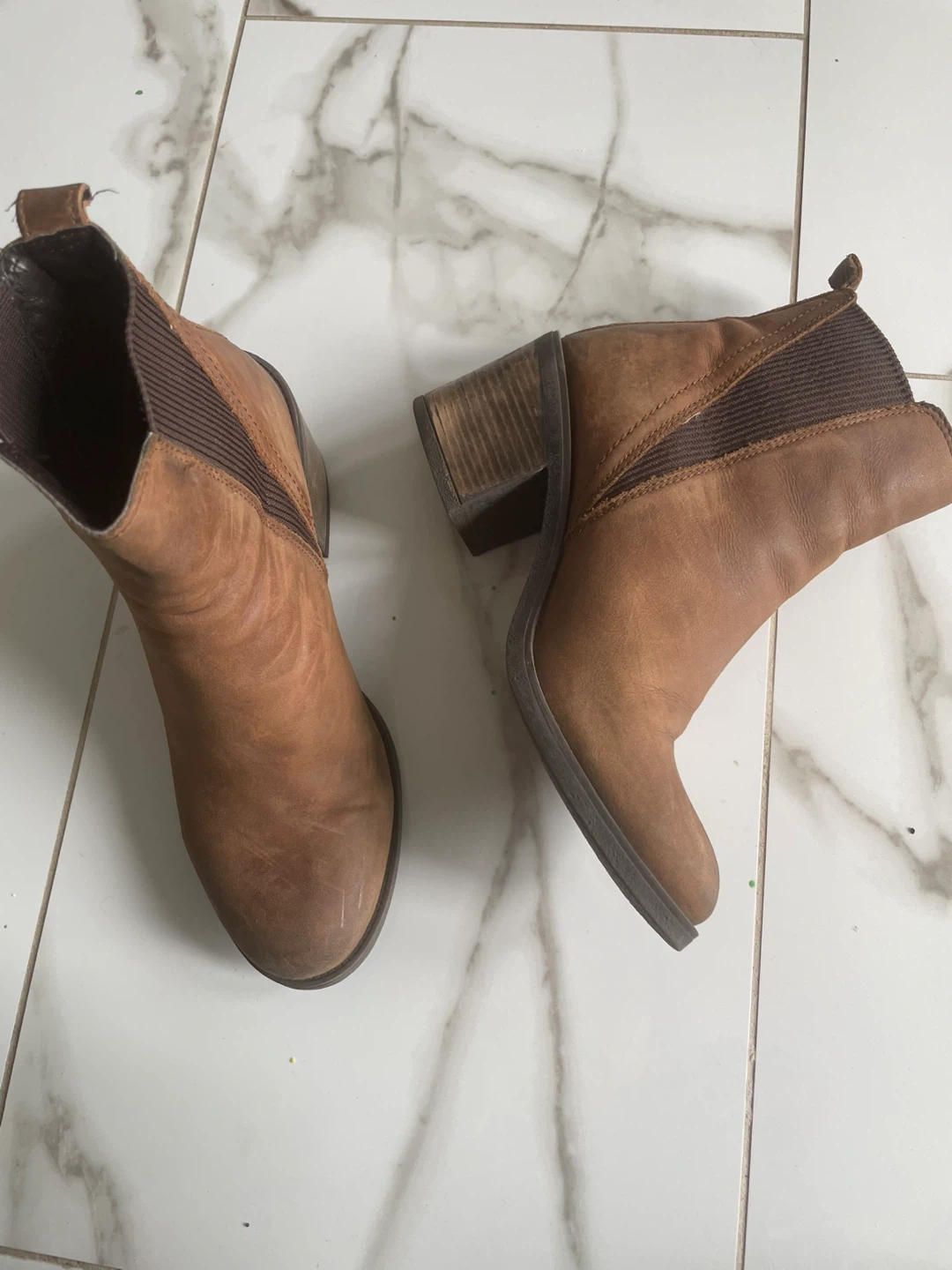 Selling a pair of brown leather ankle boots. They show some signs of wear, as you can see in the photos, but they've still got lots of life left in them. Great for fall!