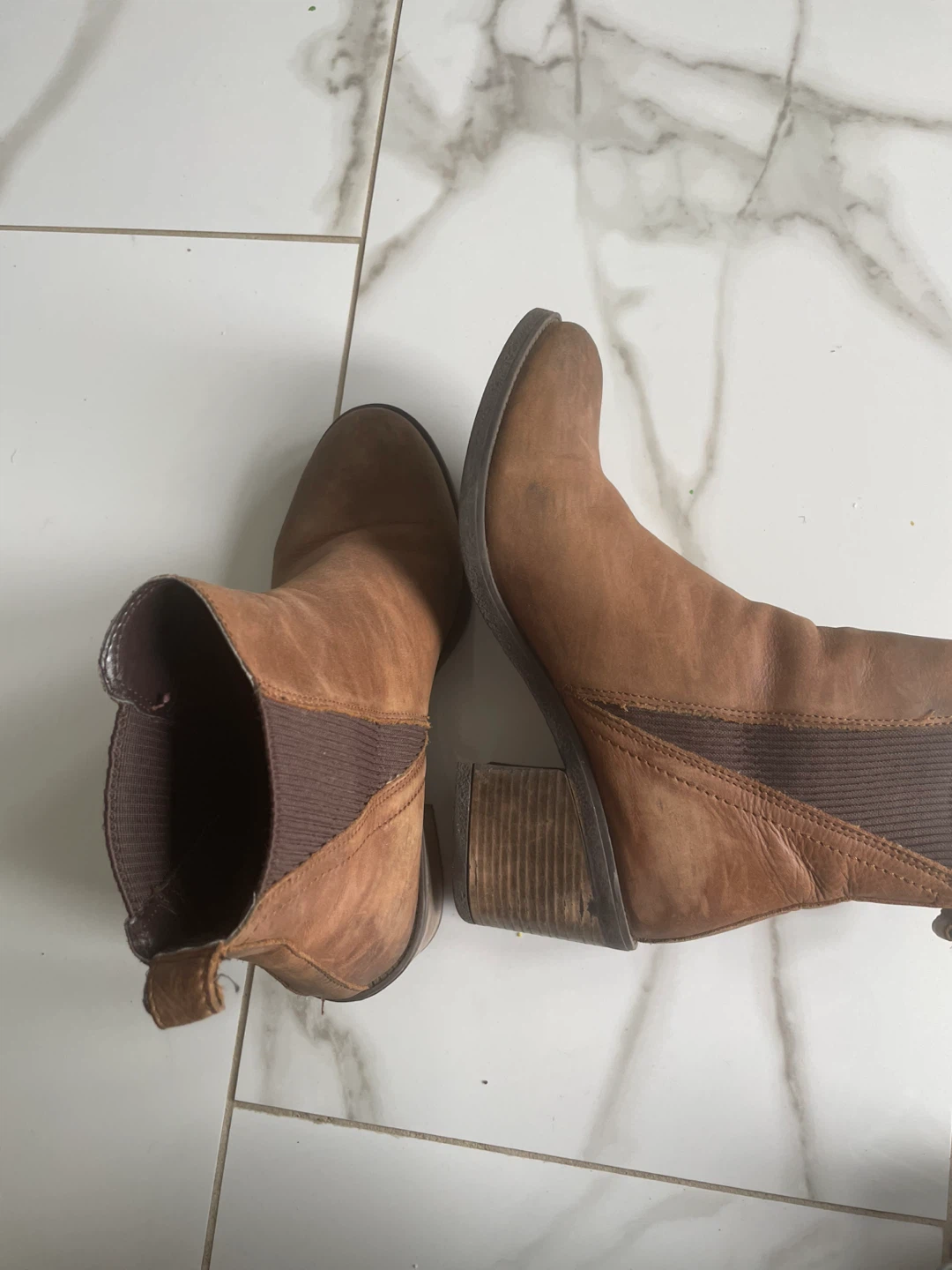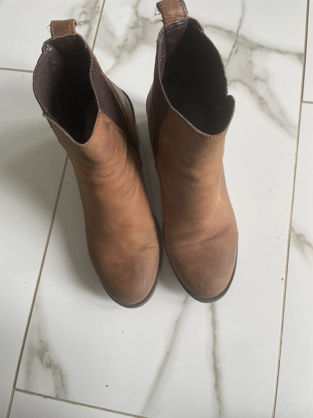 Selling a pair of brown leather ankle boots. They show some signs of wear, as you can see in the photos, but they've still got lots of life left in them. Great for fall!