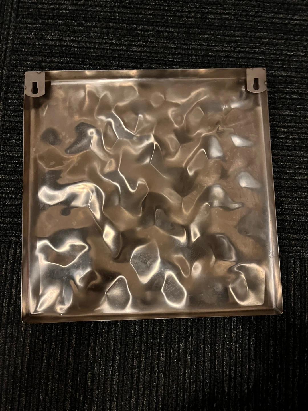 This set includes two hammered metal square wall art panels with a unique wavy texture. Each panel has a silver and gold metallic finish. They're suitable for adding a modern touch to any room's decor.