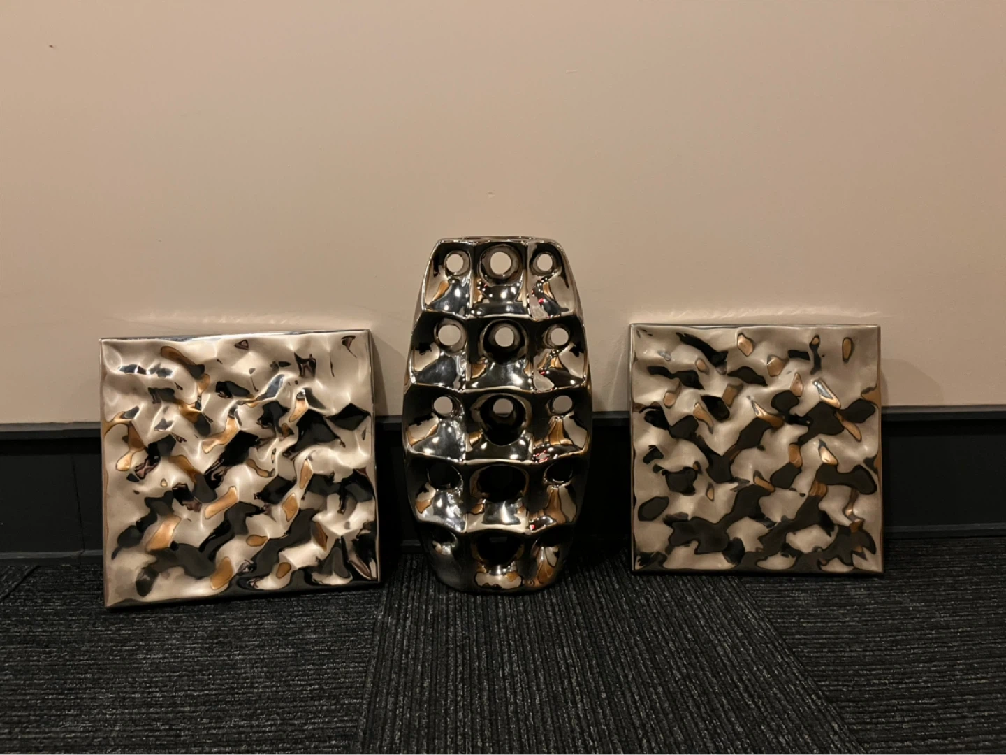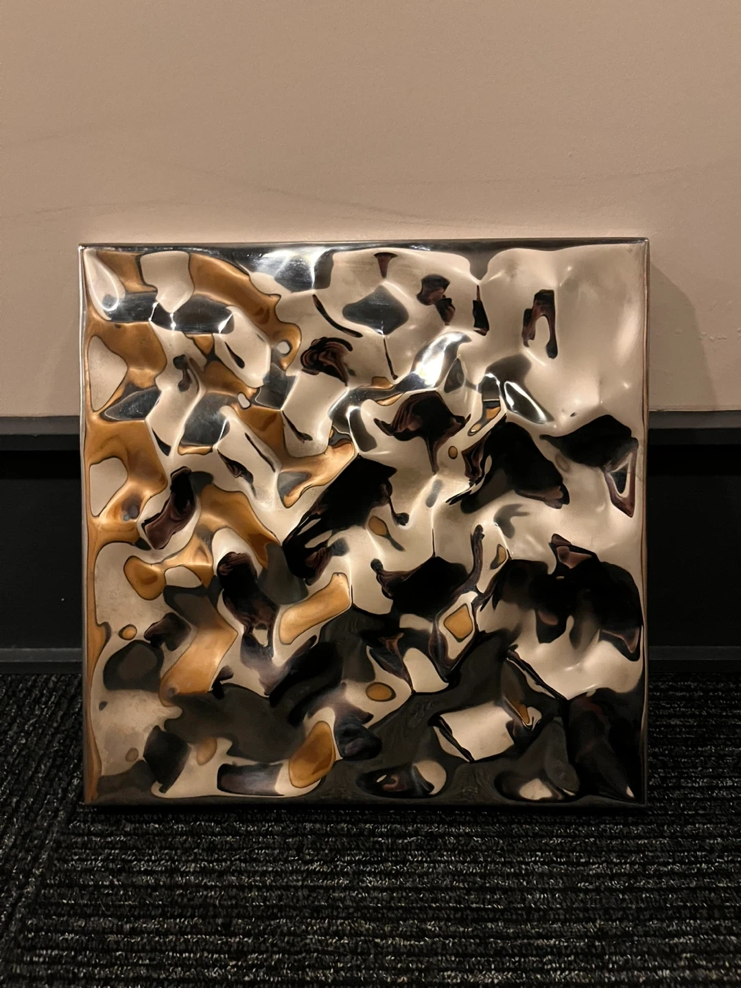 This set includes two hammered metal square wall art panels with a unique wavy texture. Each panel has a silver and gold metallic finish. They're suitable for adding a modern touch to any room's decor.
