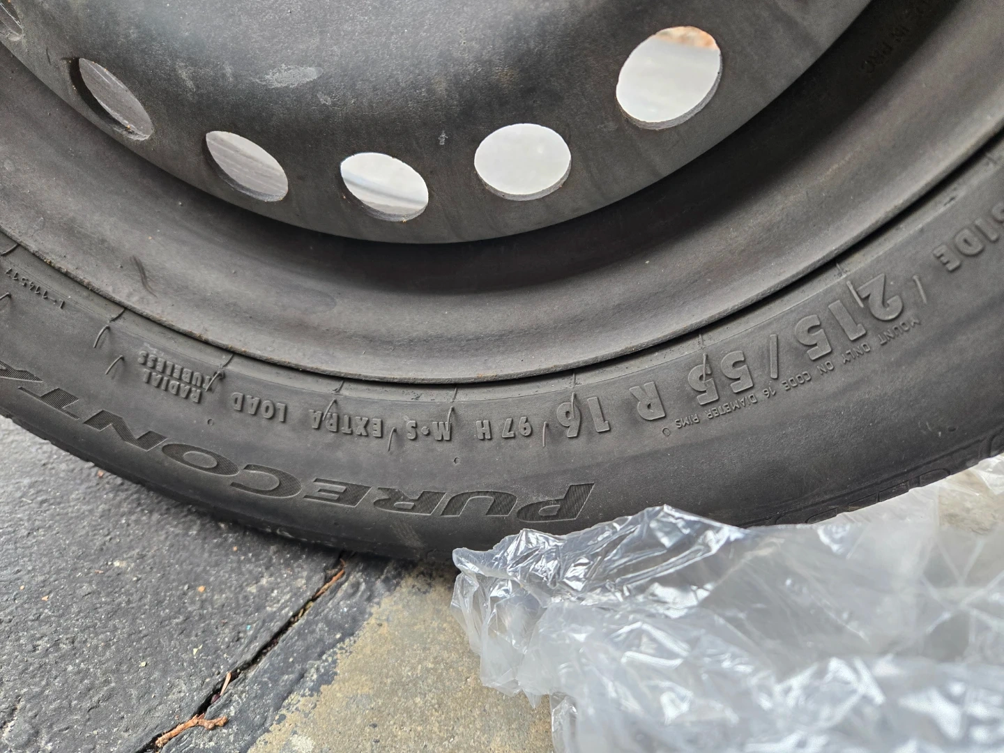 Set of 4X Continental PureContact LS tire mounted on a steel rim. Tire size 215/55 R 16. Rim has a 5x114.3 bolt pattern. Made in USA. DOT 1DD3 J4X 0422.