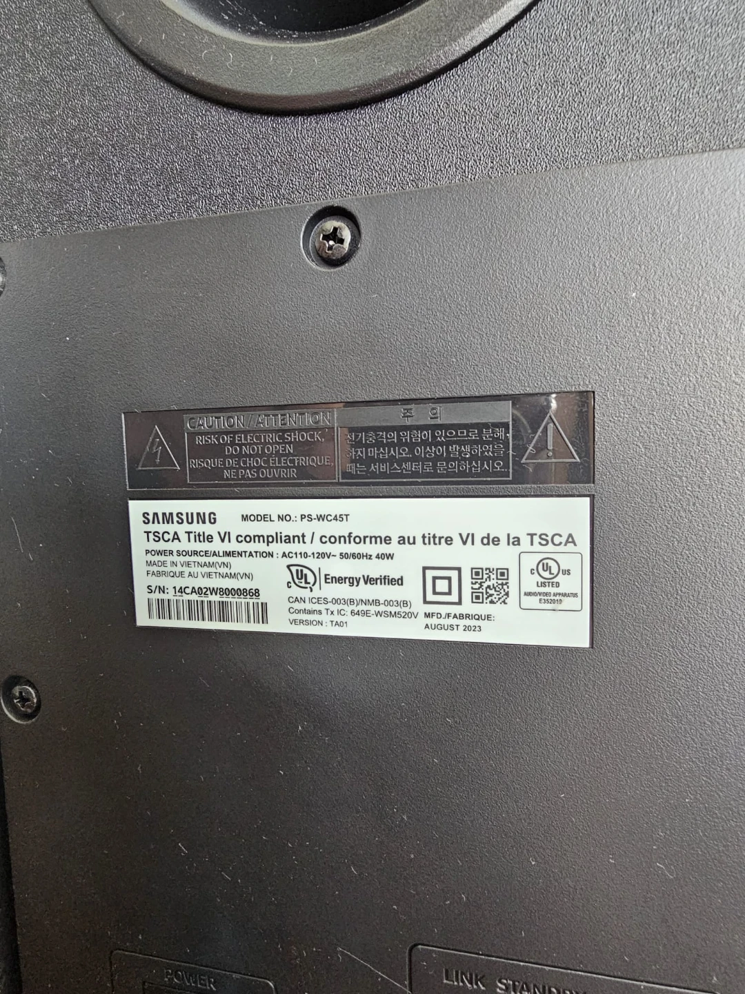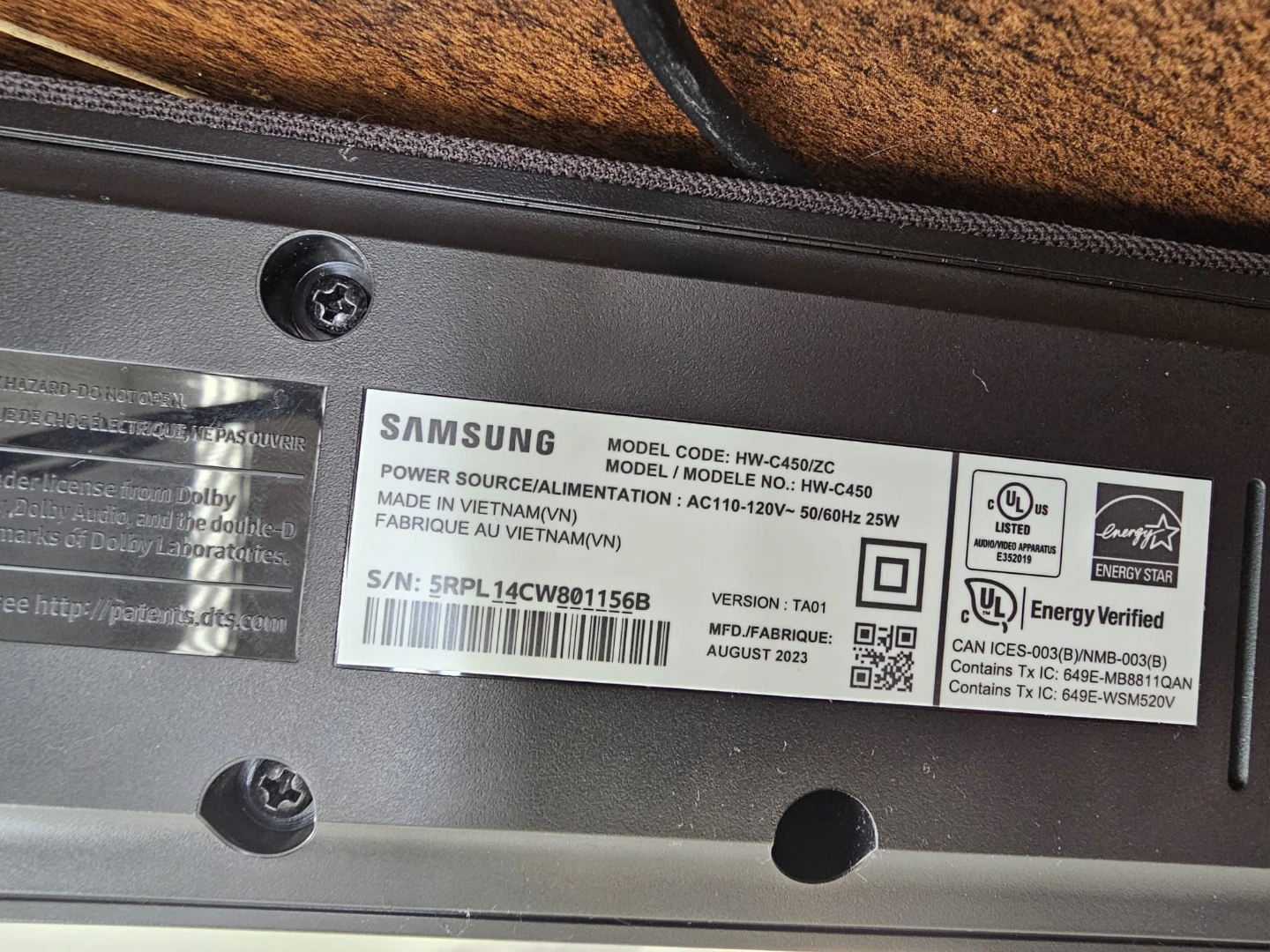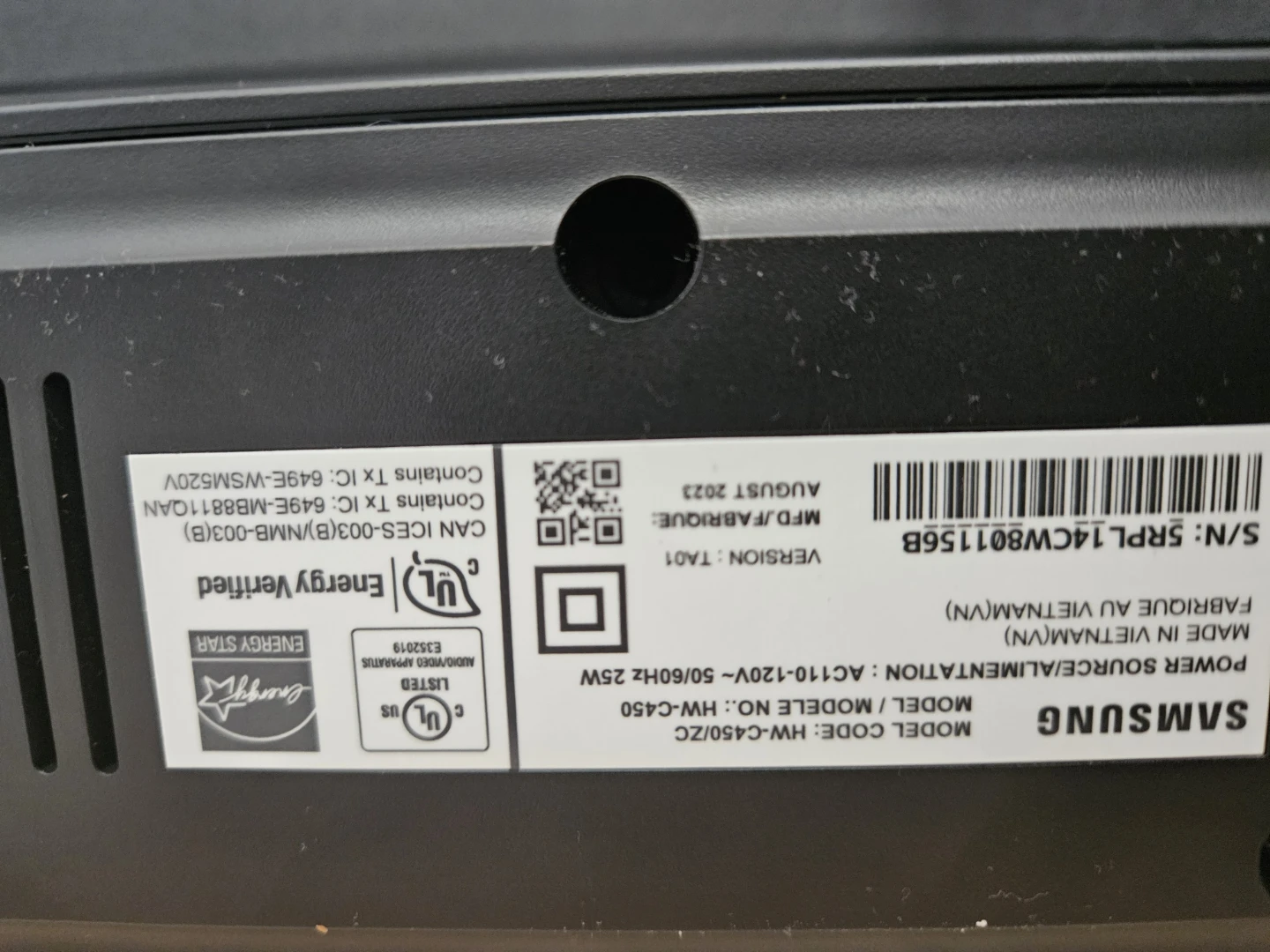 Samsung HW-C450 2.1 channel sound bar with a wireless subwoofer. Made in Vietnam. Manufactured August 2023. Power source is AC 110-120V, 50/60Hz, 25W.