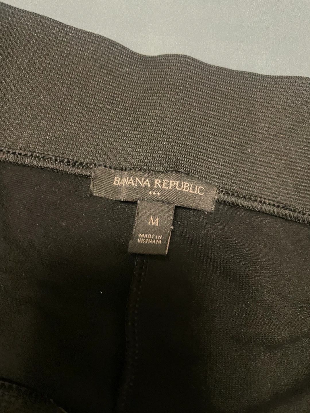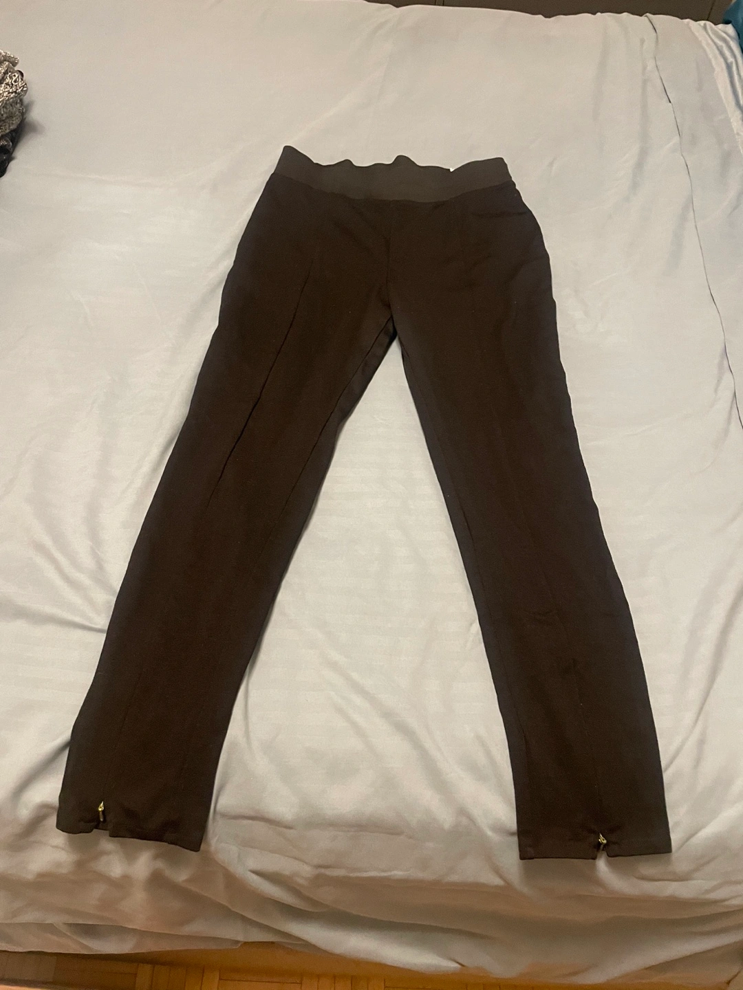 Black pants with a wide waistband and gold zipper details on the sides. Size Medium.