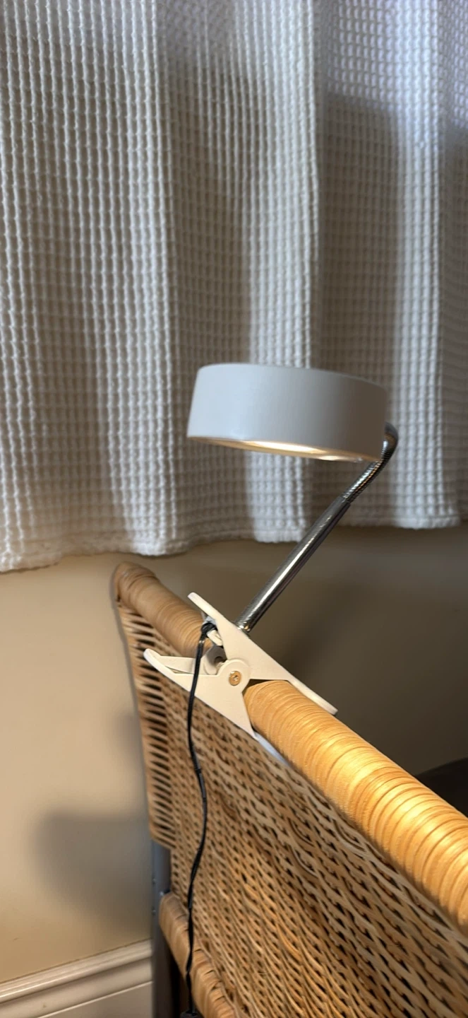 Convenient clip-on lamp for reading or close tasks. Features an adjustable arm and a white shade. Metal construction with a white clamp for secure attachment.