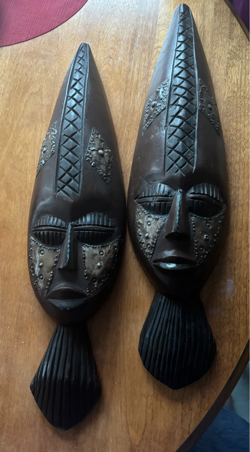 Two decorative wooden masks featuring intricate metallic detailing. These handcrafted pieces are perfect for adding a unique touch to your home decor. Handmade in Ghana.