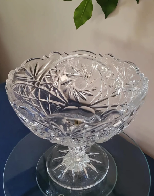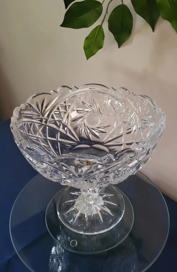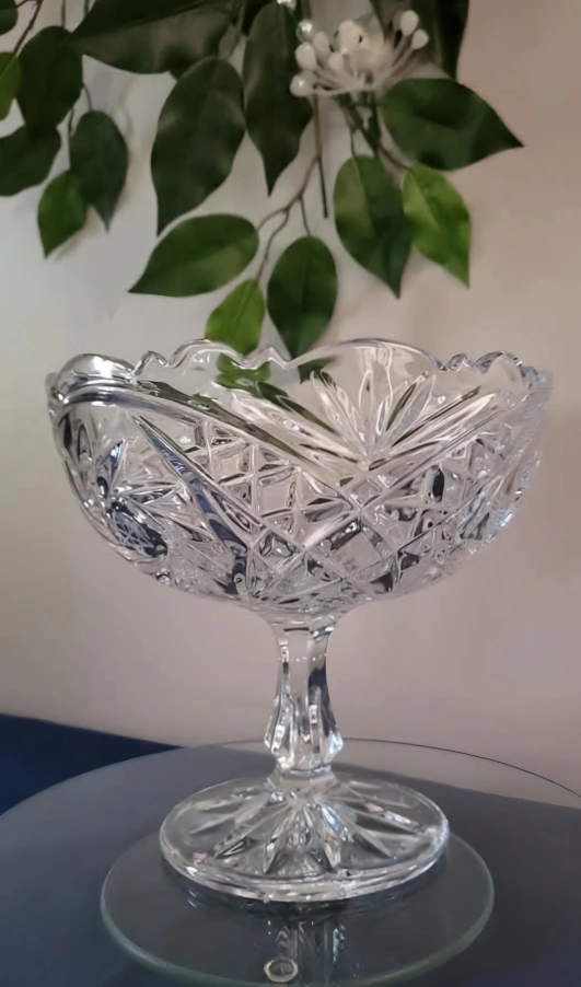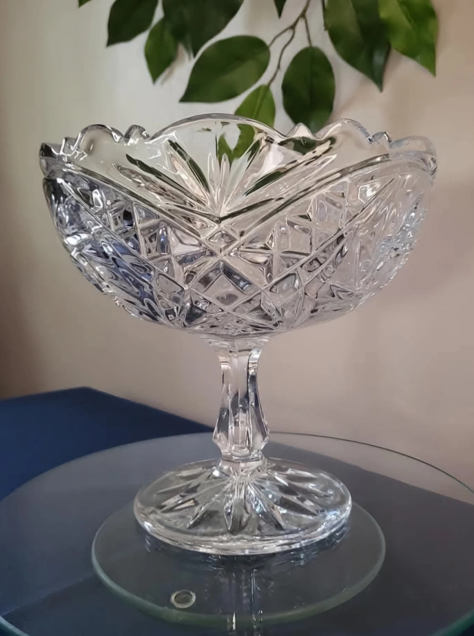 This Crystal Compote Bowl has a beautiful pinwheel pattern with an etched star in the center making it a lovely addition to your Collection or a gift for Someone Special