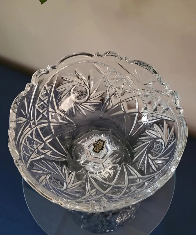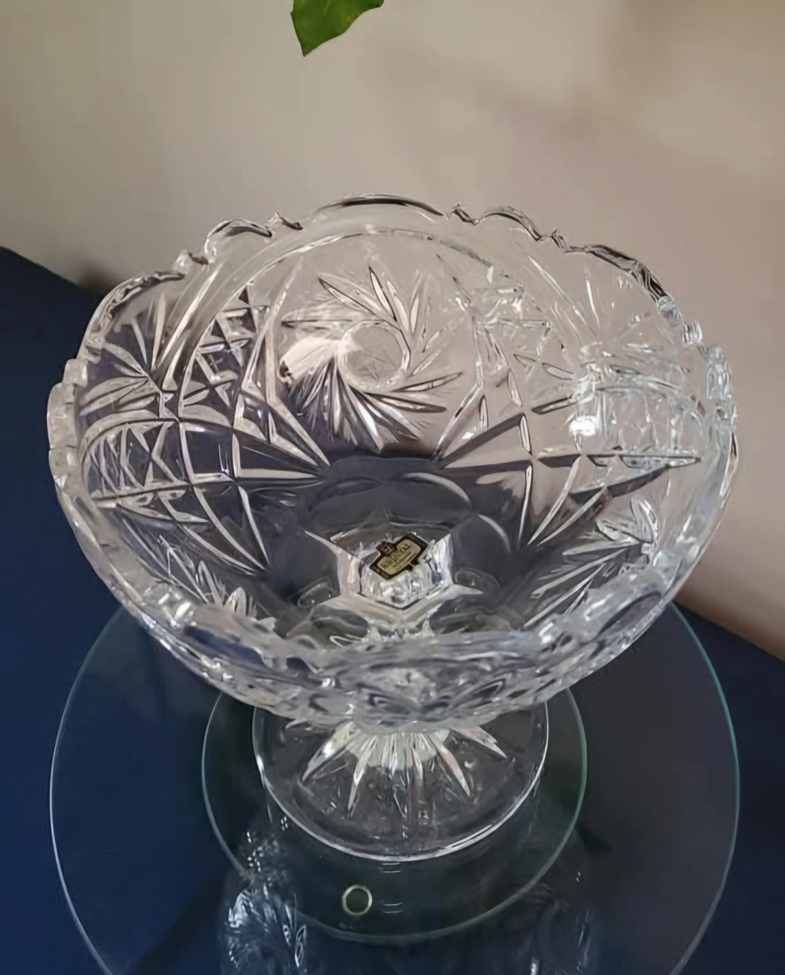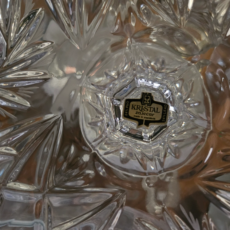 A lovely Crystal Compote with the original label which reads: 24 % Lead Crystal, 24%PbO, Kristal Zajecar, Made in Yugoslovia.