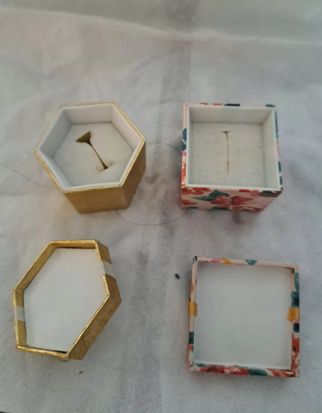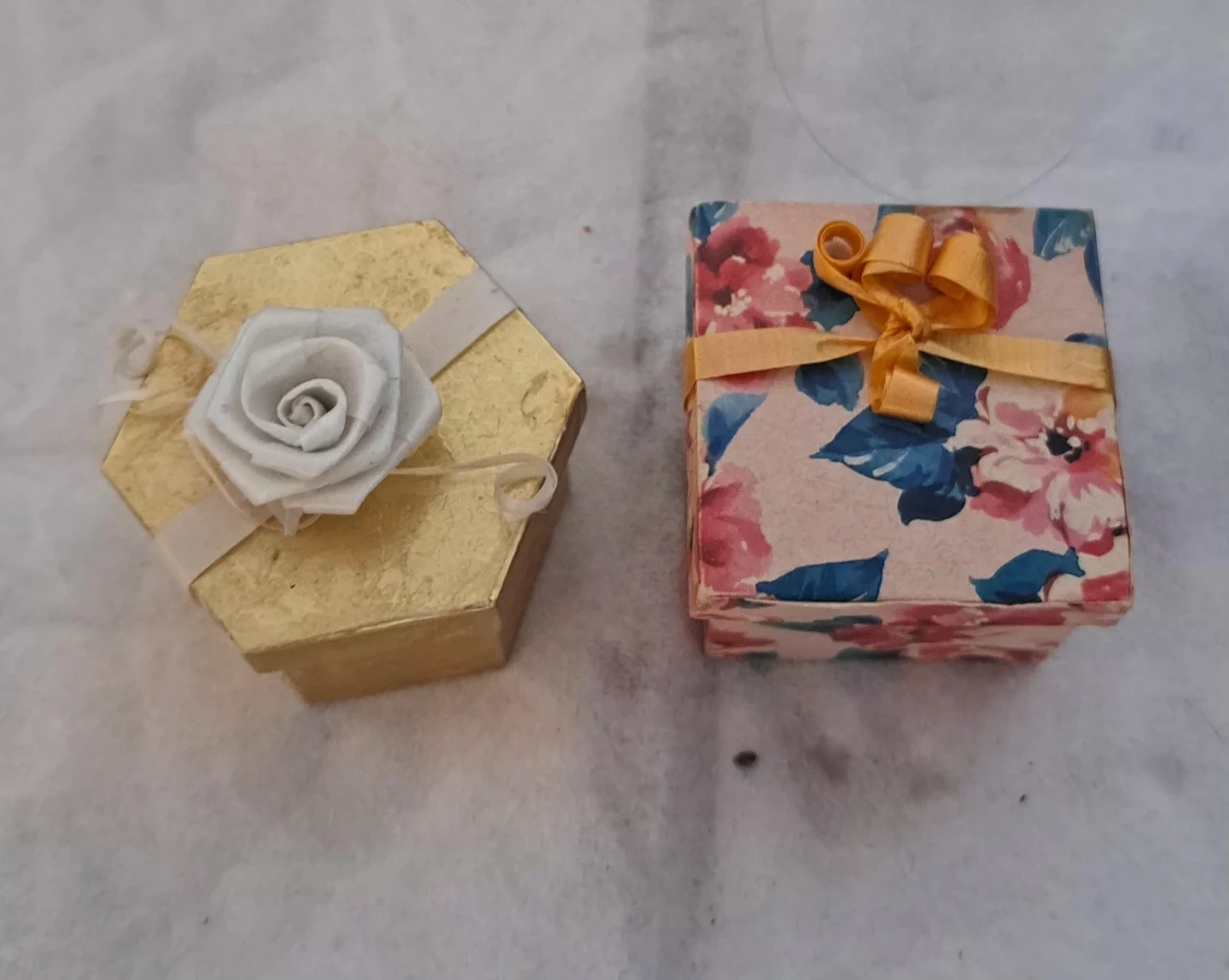 Two lovely small boxes, perfect for gifting rings or other small treasures. One hexagonal gold box with a fabric rose detail, and one square floral box with a ribbon. Both have clean interiors, ready for your special gift!