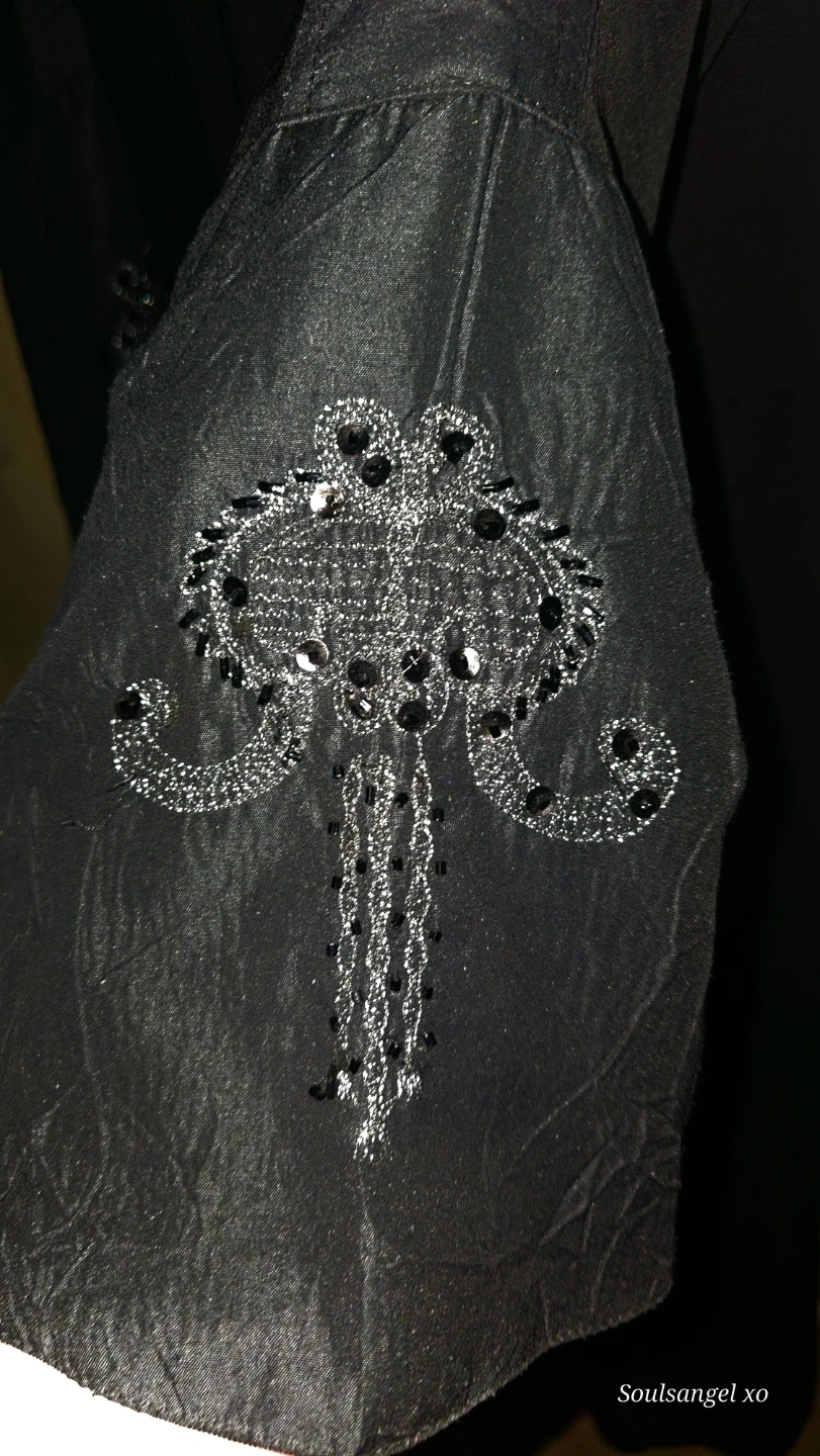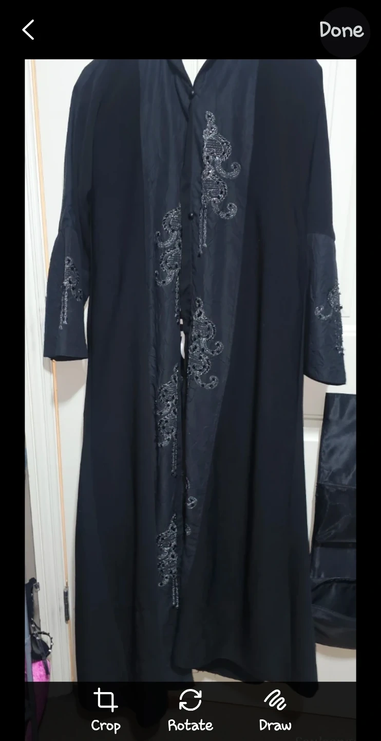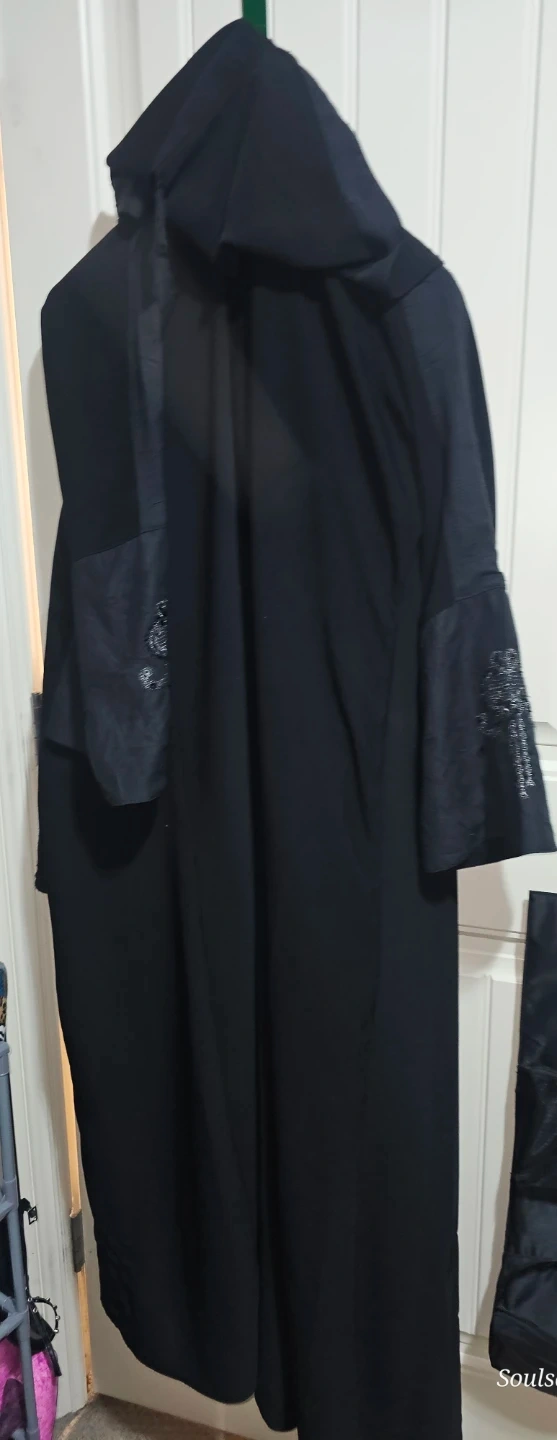 Selling a beautiful black hooded abaya. It features lovely embellishments on the sleeves, adding a touch of elegance to the design. It's in great condition and ready for a new owner!