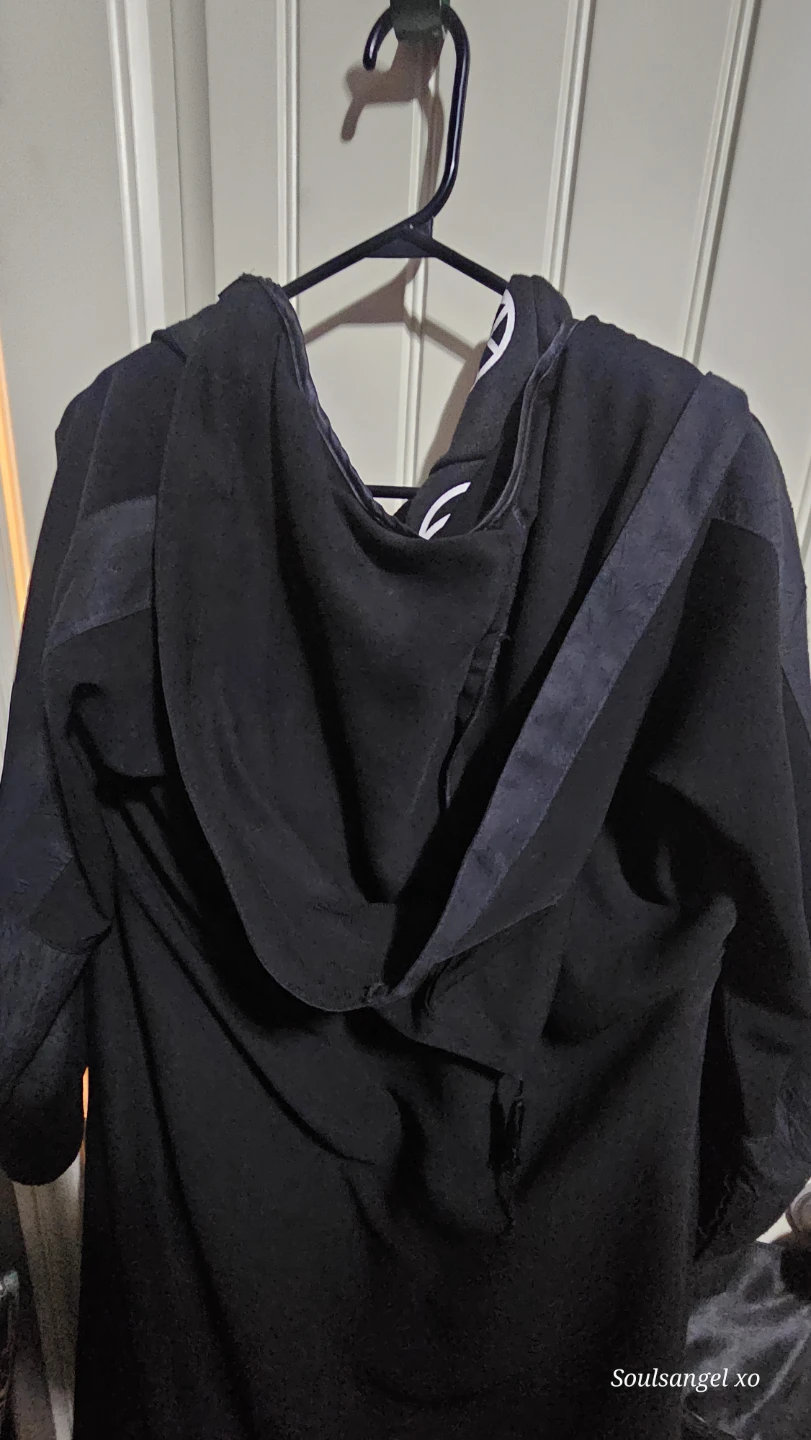 Selling a beautiful black hooded abaya. It features lovely embellishments on the sleeves, adding a touch of elegance to the design. It's in great condition and ready for a new owner!