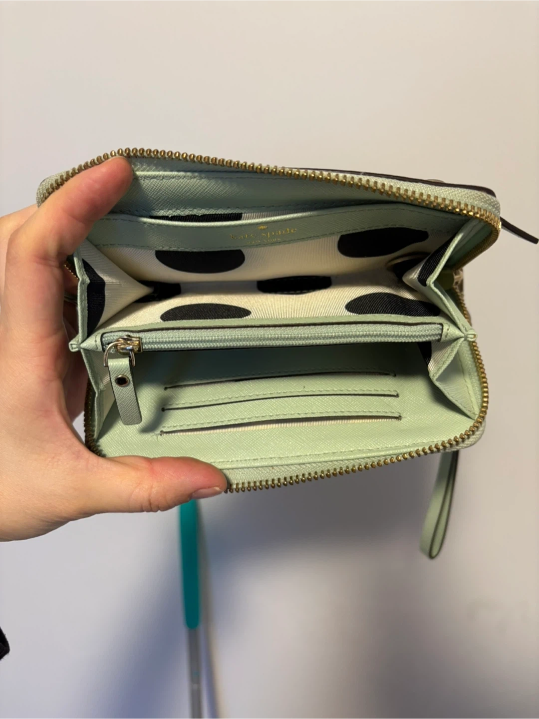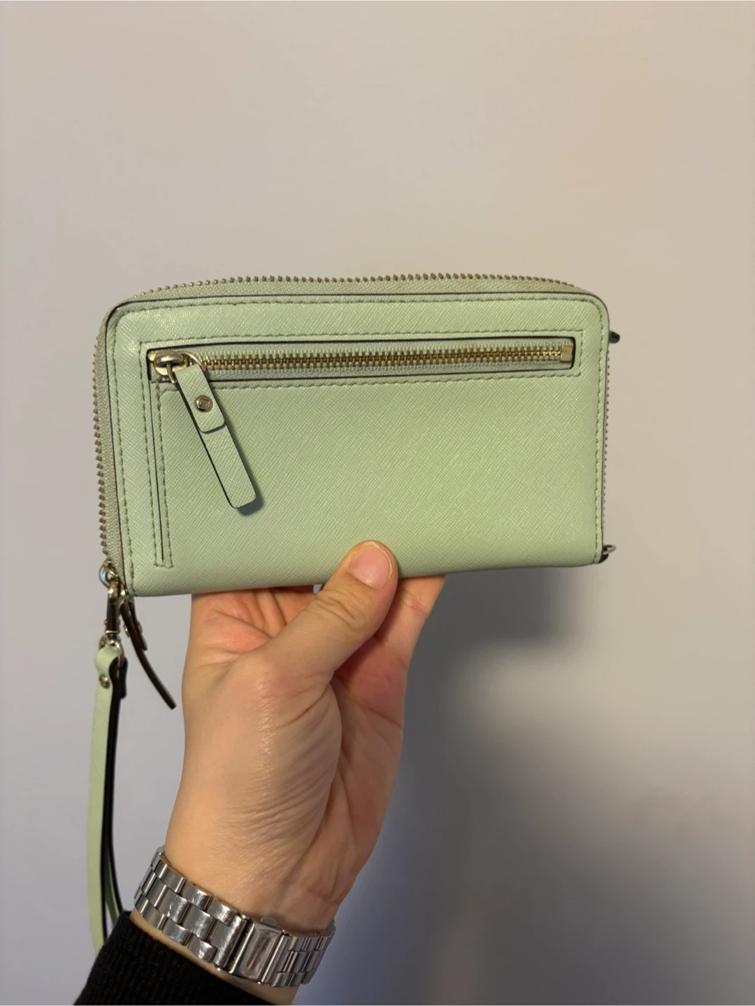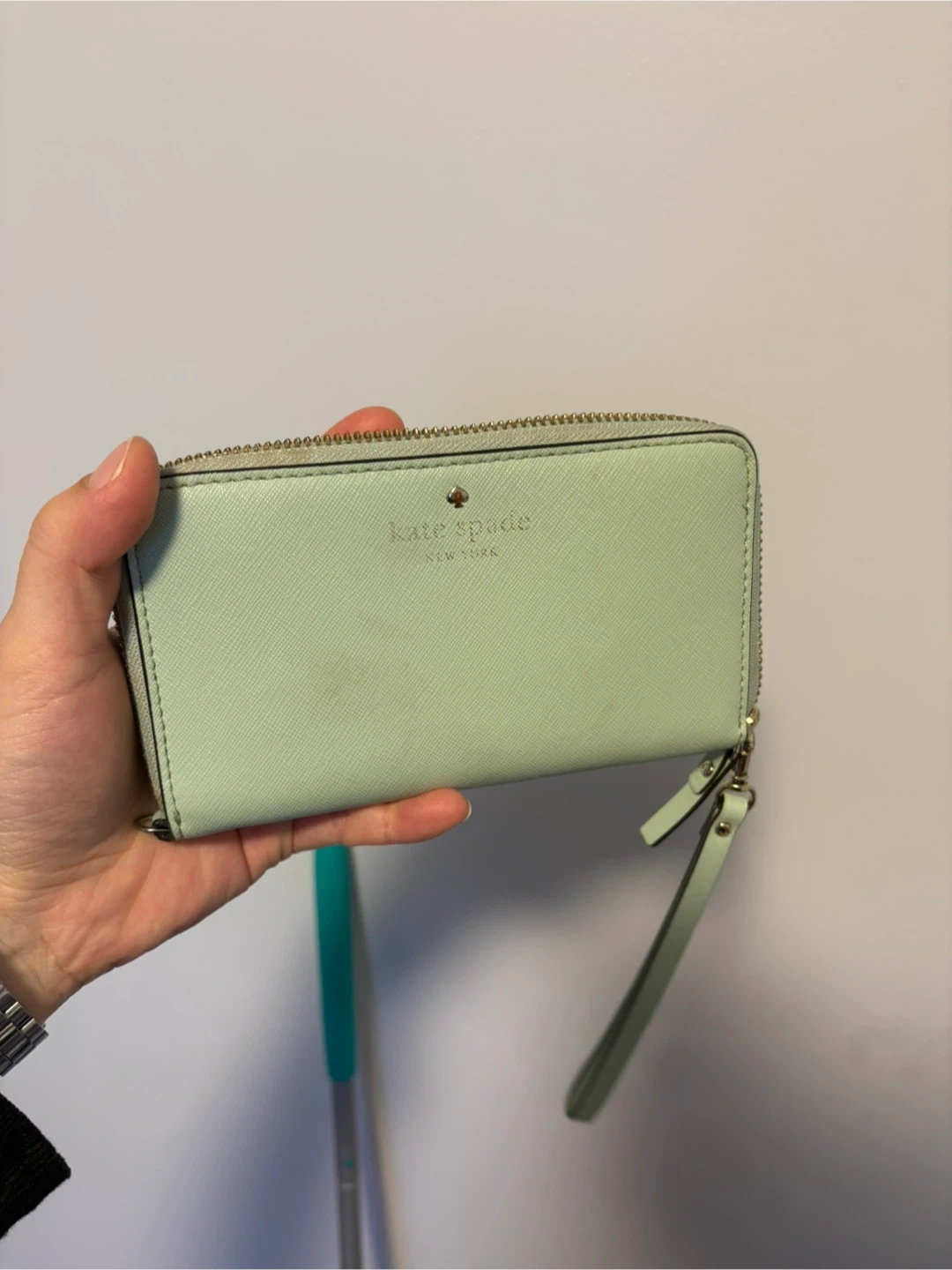 This Kate Spade wristlet wallet is a light green colour. It's made of textured leather with gold hardware. Plenty of card slots inside!
