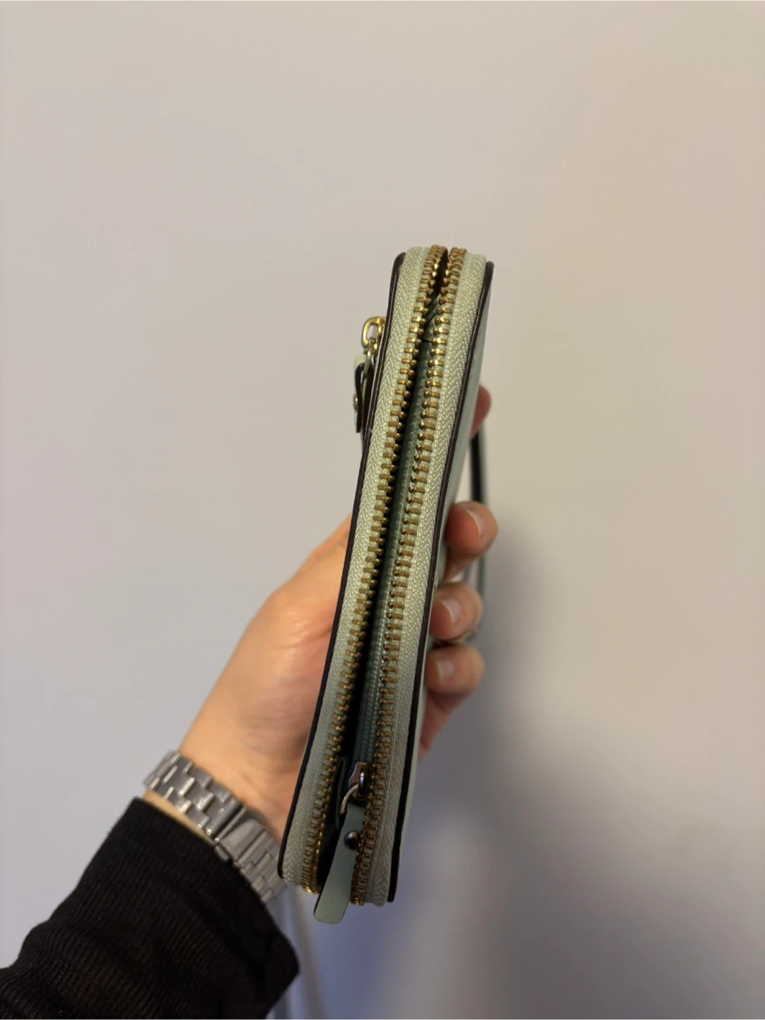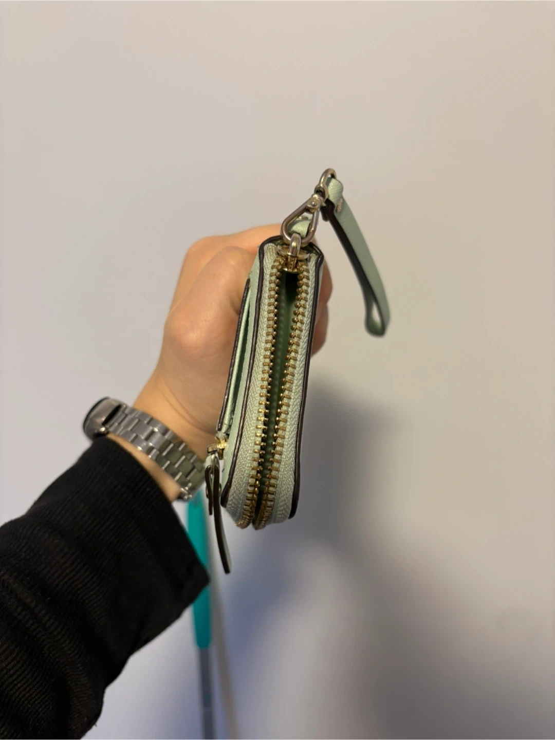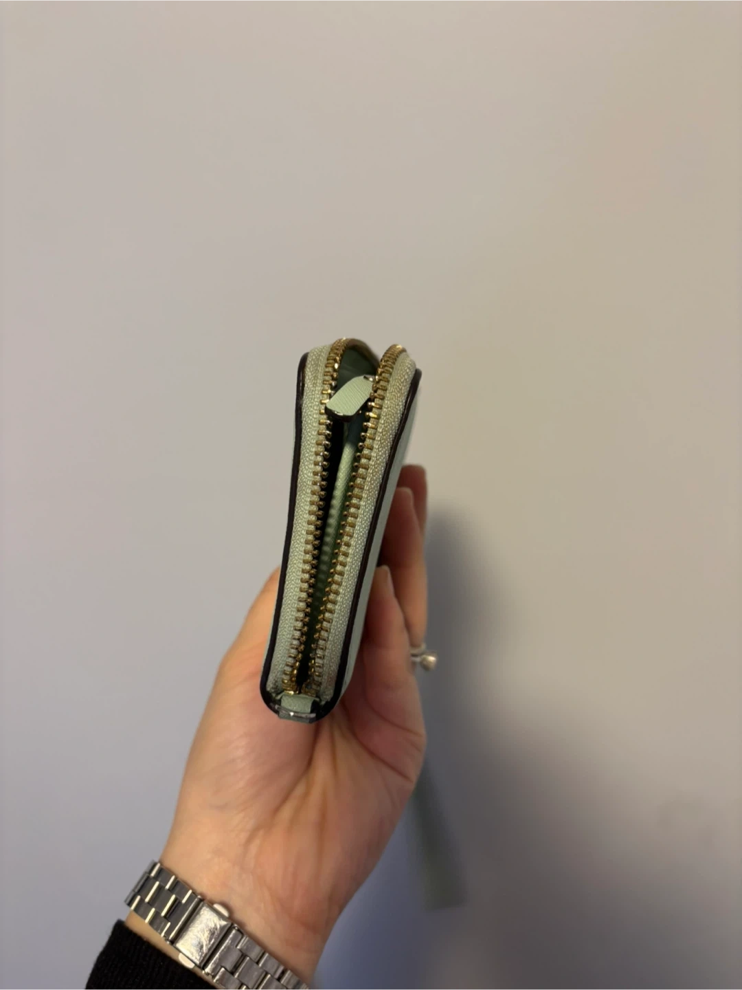 This Kate Spade wristlet wallet is a light green colour. It's made of textured leather with gold hardware. Plenty of card slots inside!