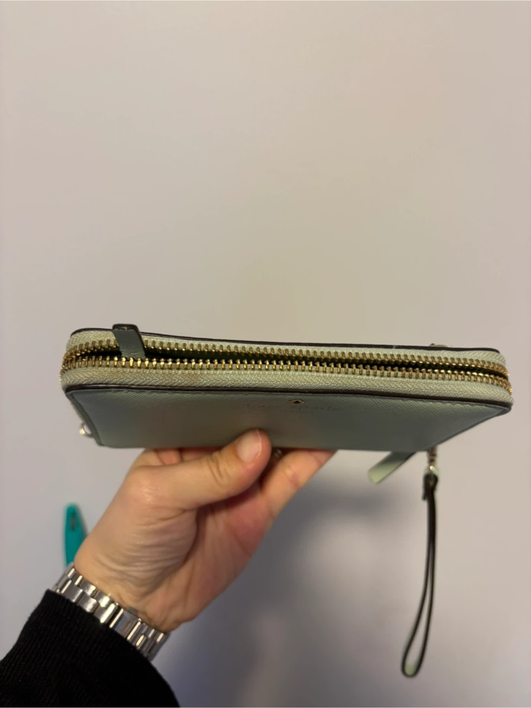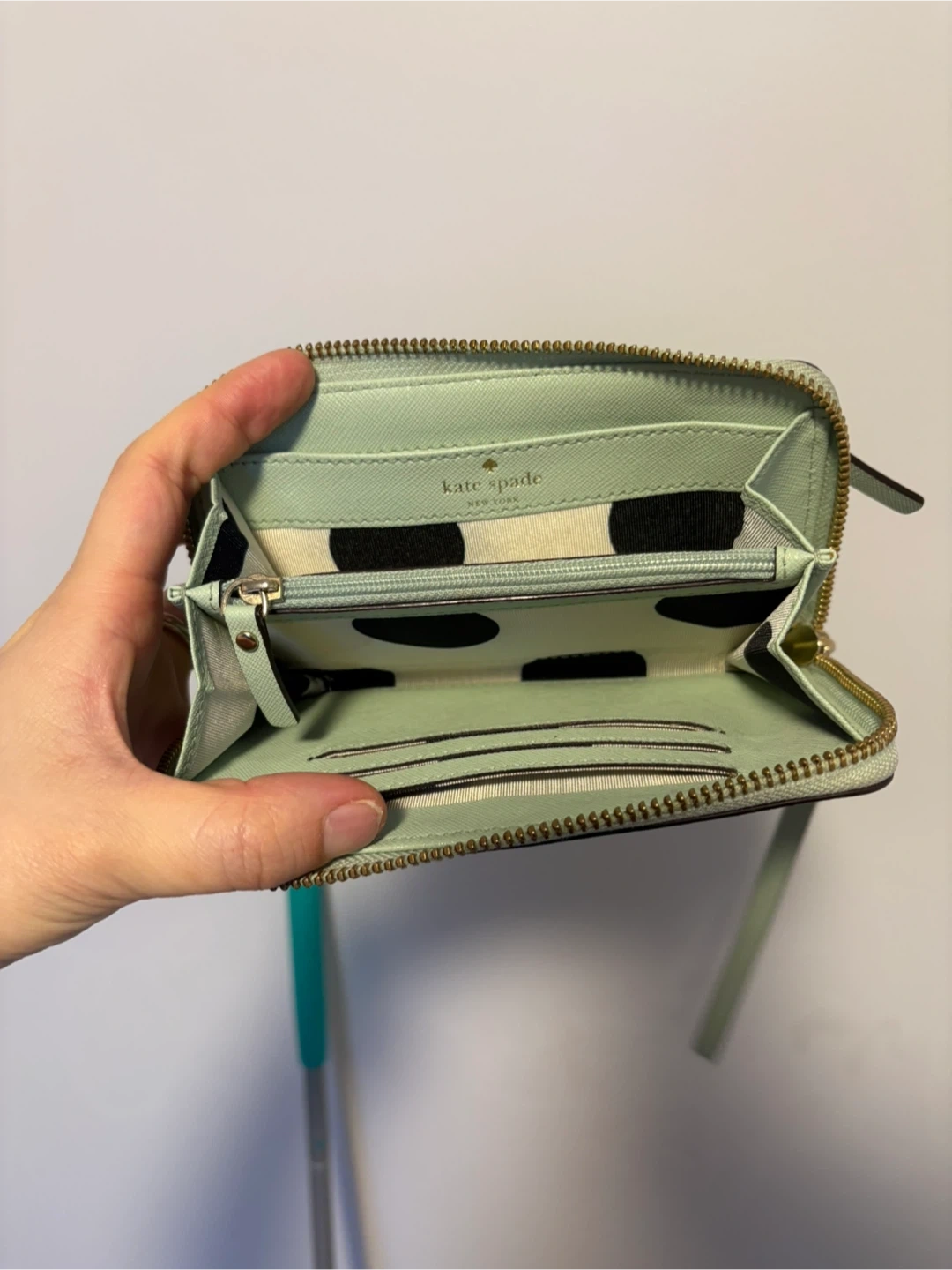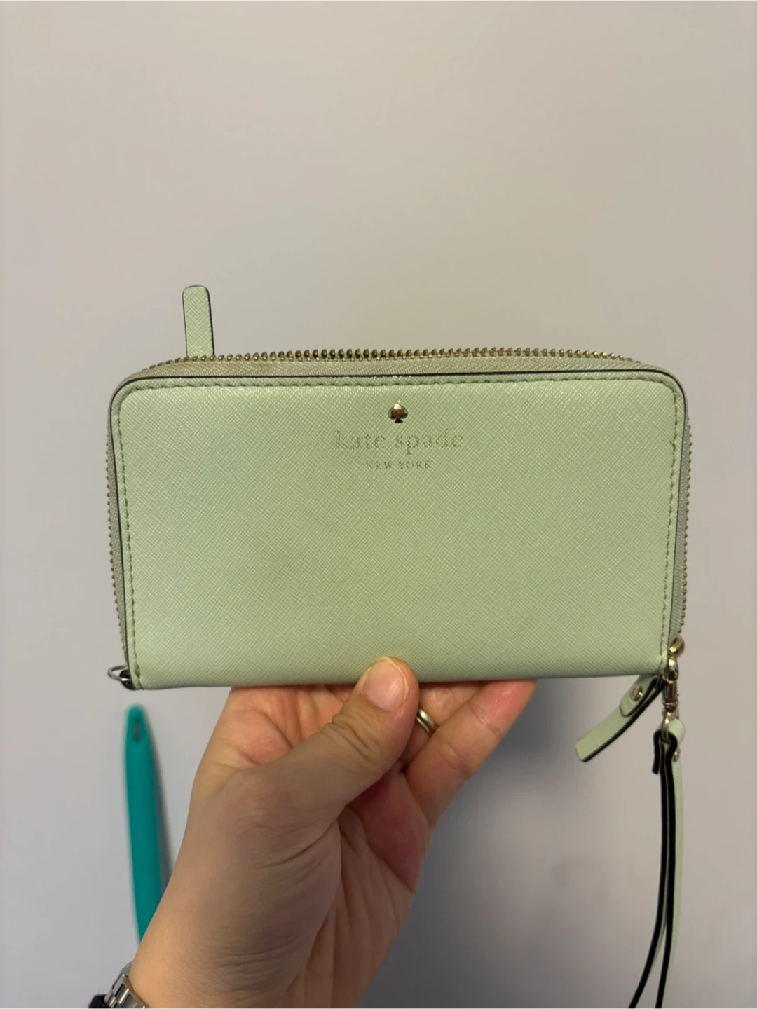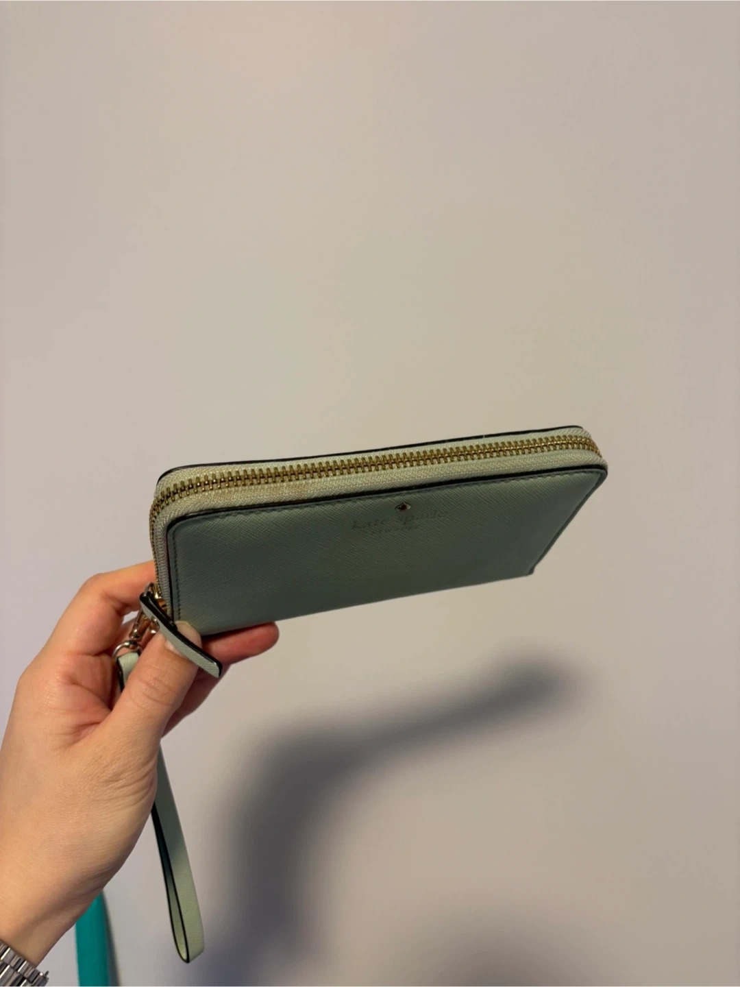 This Kate Spade wristlet wallet is a light green colour. It's made of textured leather with gold hardware. Plenty of card slots inside!