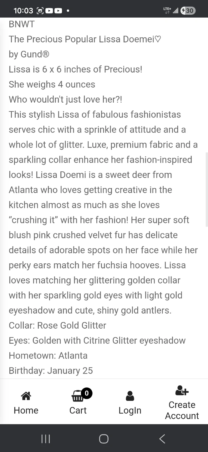 This stylish Lissa plush is from Gund. It's 6 x 6 inches and weighs 4 ounces. It's made with super soft blush pink crushed velvet fur and has delicate spots on her face. Her perky ears match her fuchsia hooves. This plush has a glittering golden collar and sparkling gold eyes with citrine glitter eyeshadow. Her antlers are shiny gold.