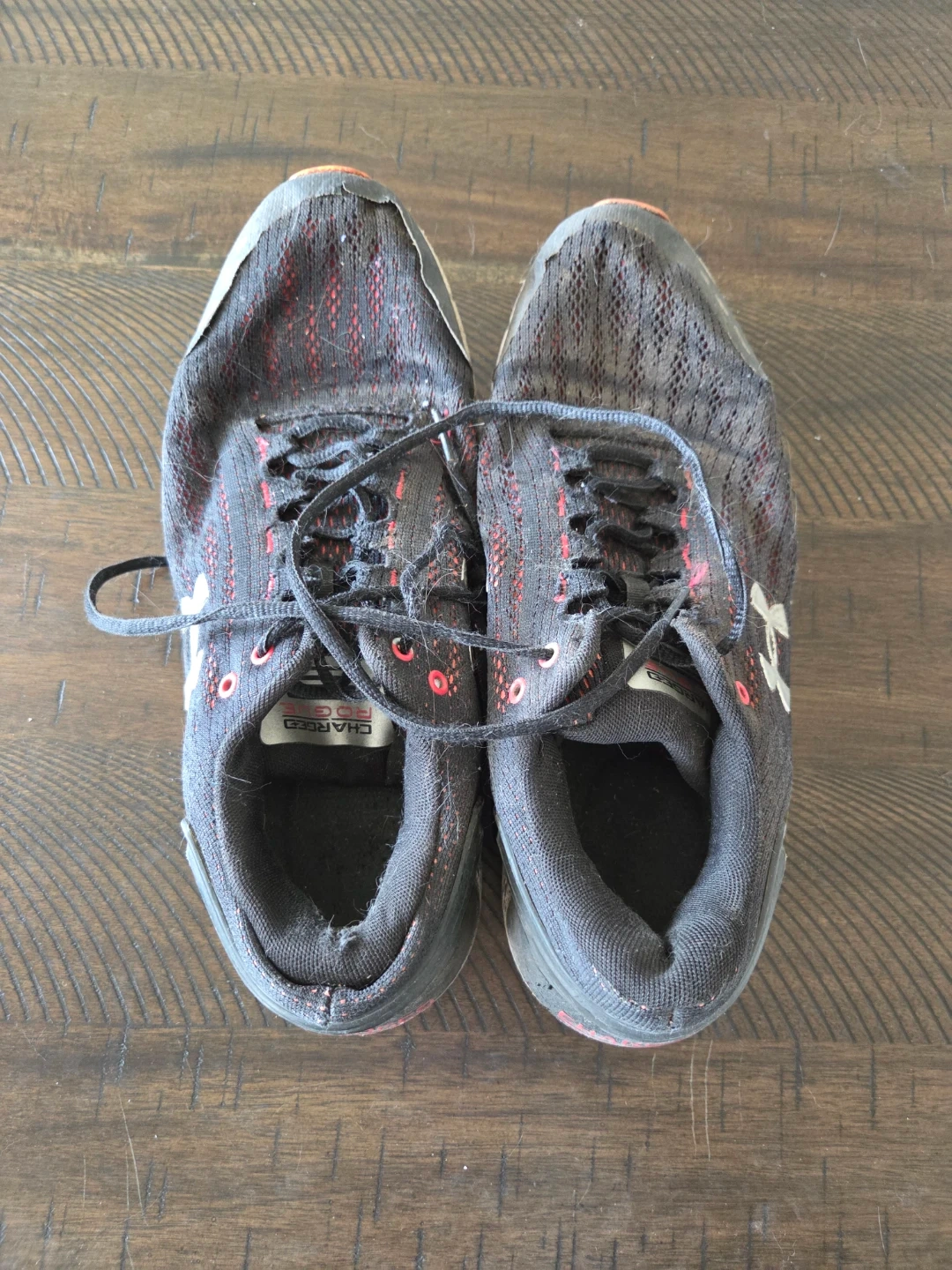 These are Under Armour Charged running shoes. They're a men's size 10. They have a breathable mesh upper and a durable rubber outsole. Well worn and a little dirty which is why they are being given away for free.
