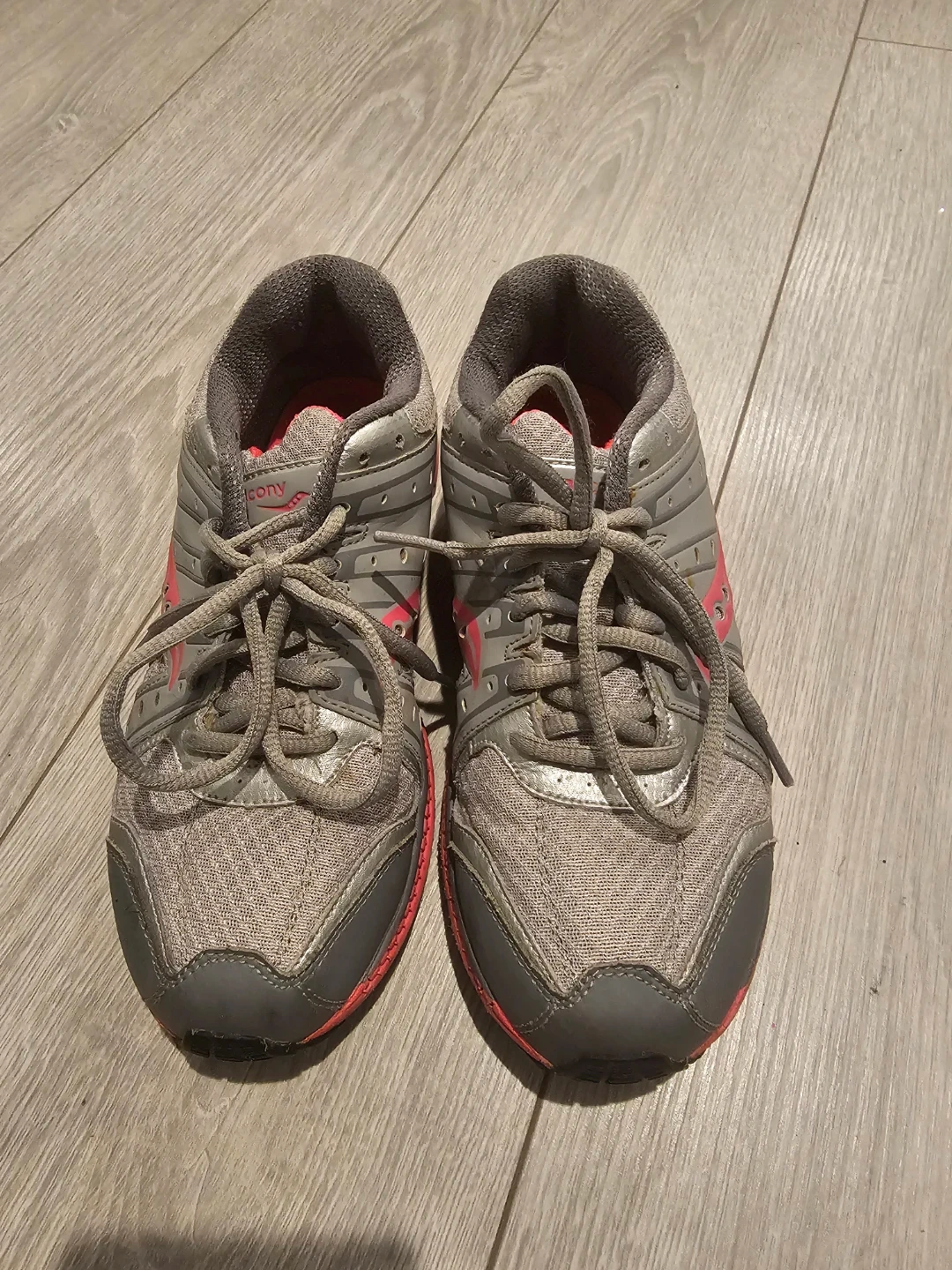 Saucony Grid Flex running shoes in grey and pink. These shoes are a women's US size 4.5. Perfect for hitting the track or the trail!