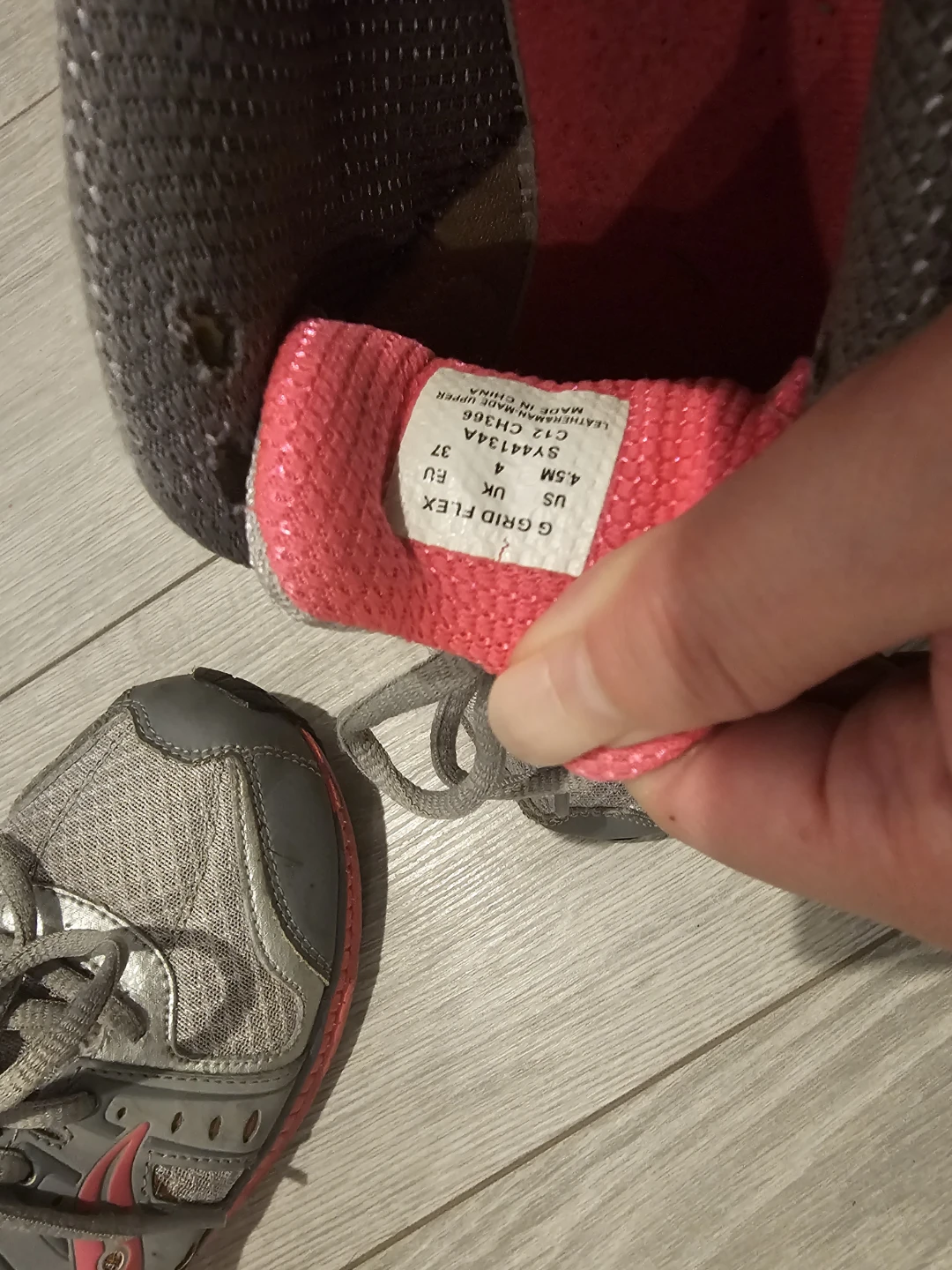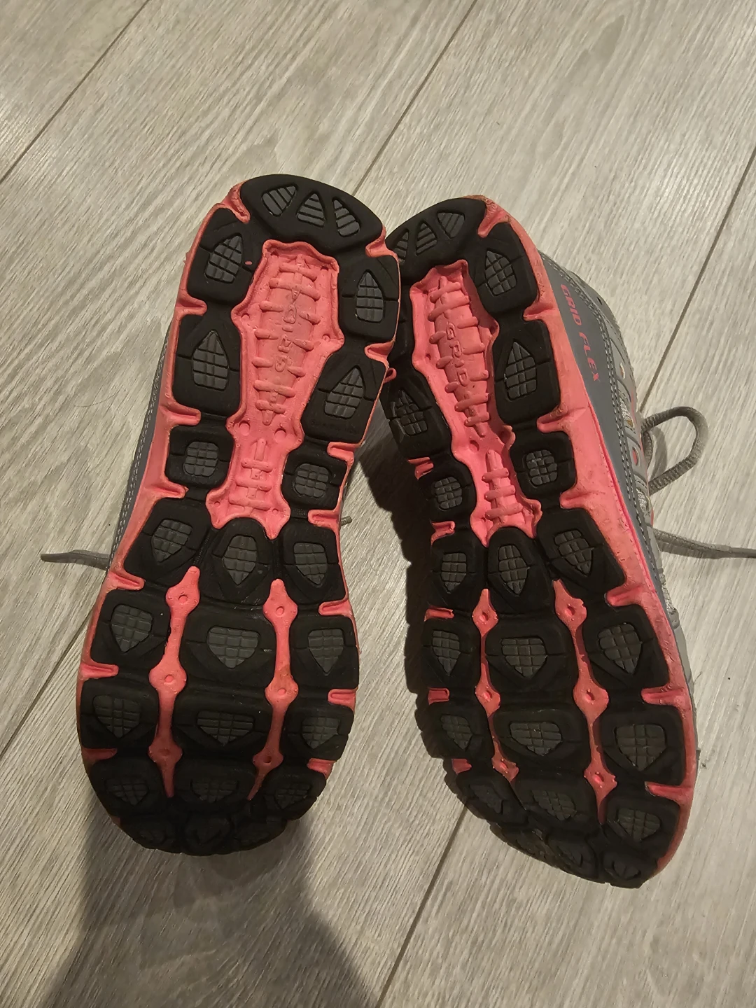 Saucony Grid Flex running shoes in grey and pink. These shoes are a women's US size 4.5. Perfect for hitting the track or the trail!
