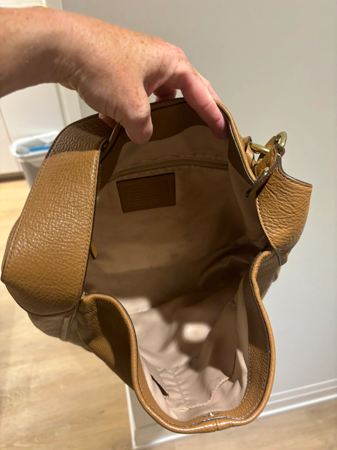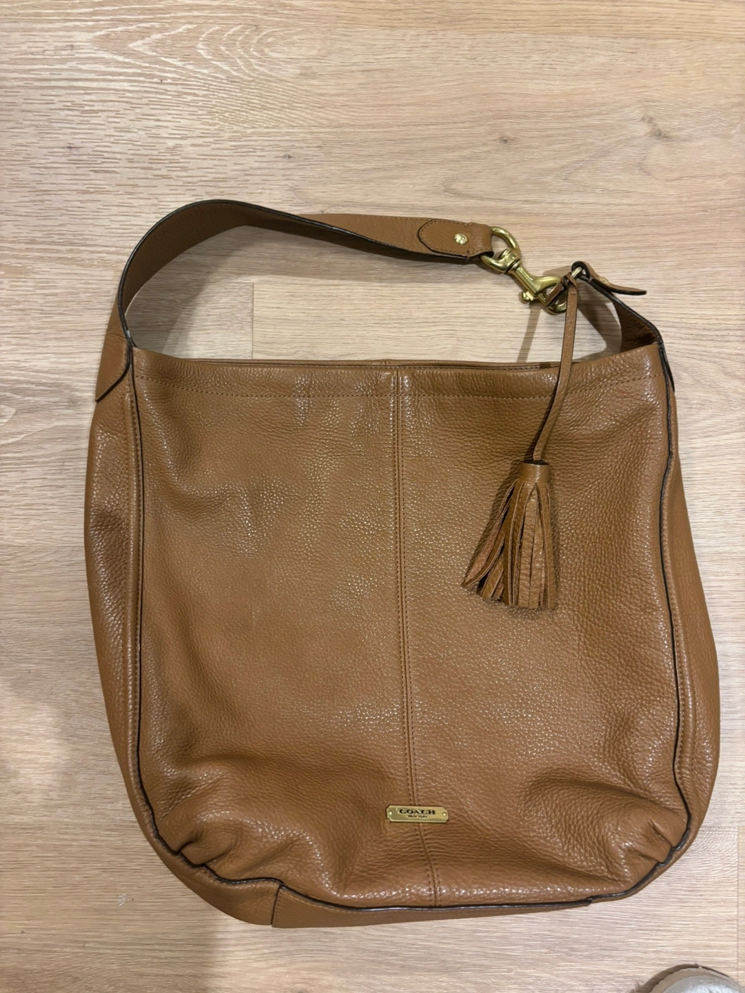 A classic Coach hobo bag in brown leather with gold hardware and a tassel. In great condition, no tears or damage to leather.
