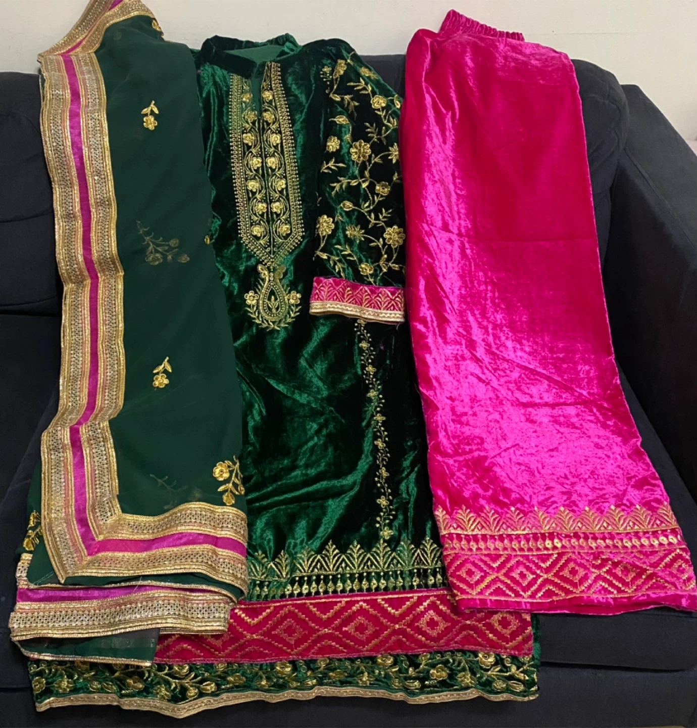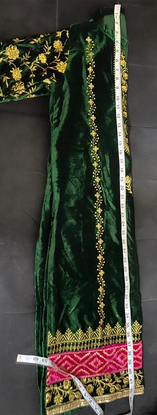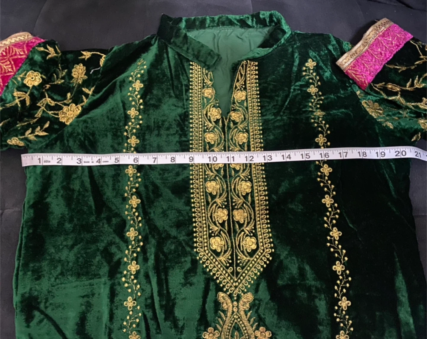 Beautiful green velvet salwar kameez suit with gold embroidery. Includes the kameez (top), salwar (pants), and dupatta (scarf). The kameez measures approximately 42 inches in length and 21 inches across the chest. Perfect for special occasions! Dress worn only once for couple hours.