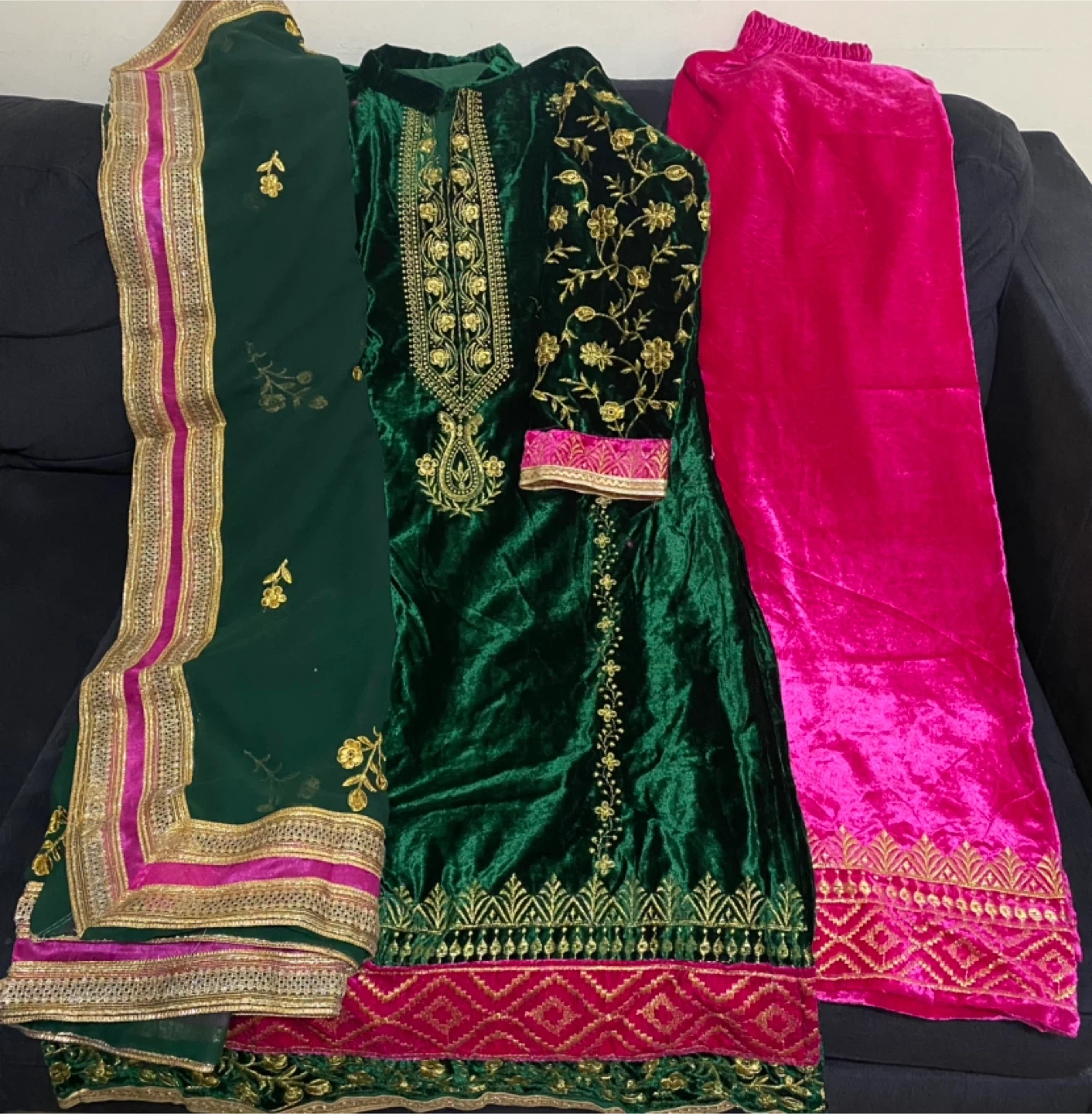 Beautiful green velvet salwar kameez suit with gold embroidery. Includes the kameez (top), salwar (pants), and dupatta (scarf). The kameez measures approximately 42 inches in length and 21 inches across the chest. Perfect for special occasions! Dress worn only once for couple hours.