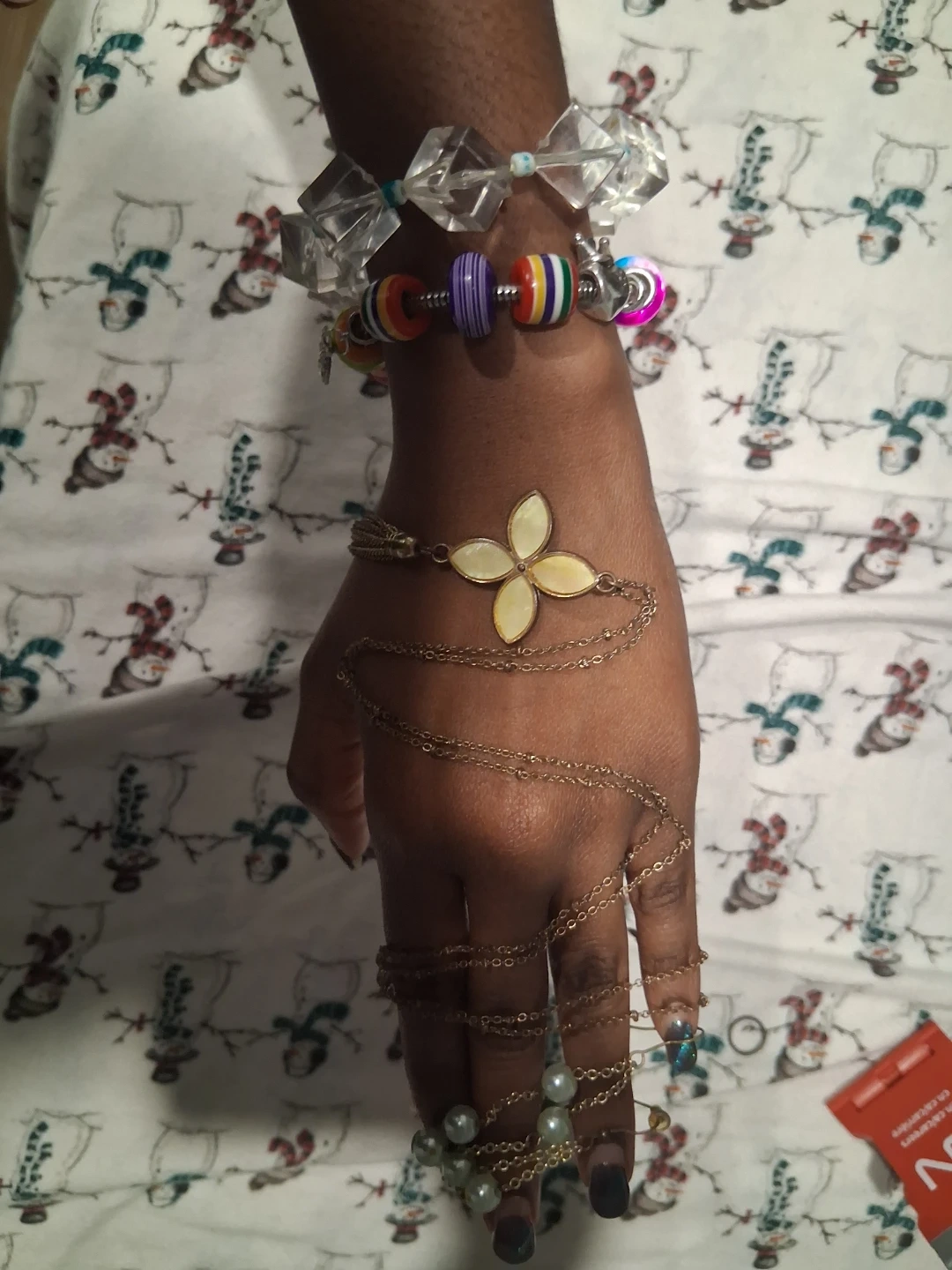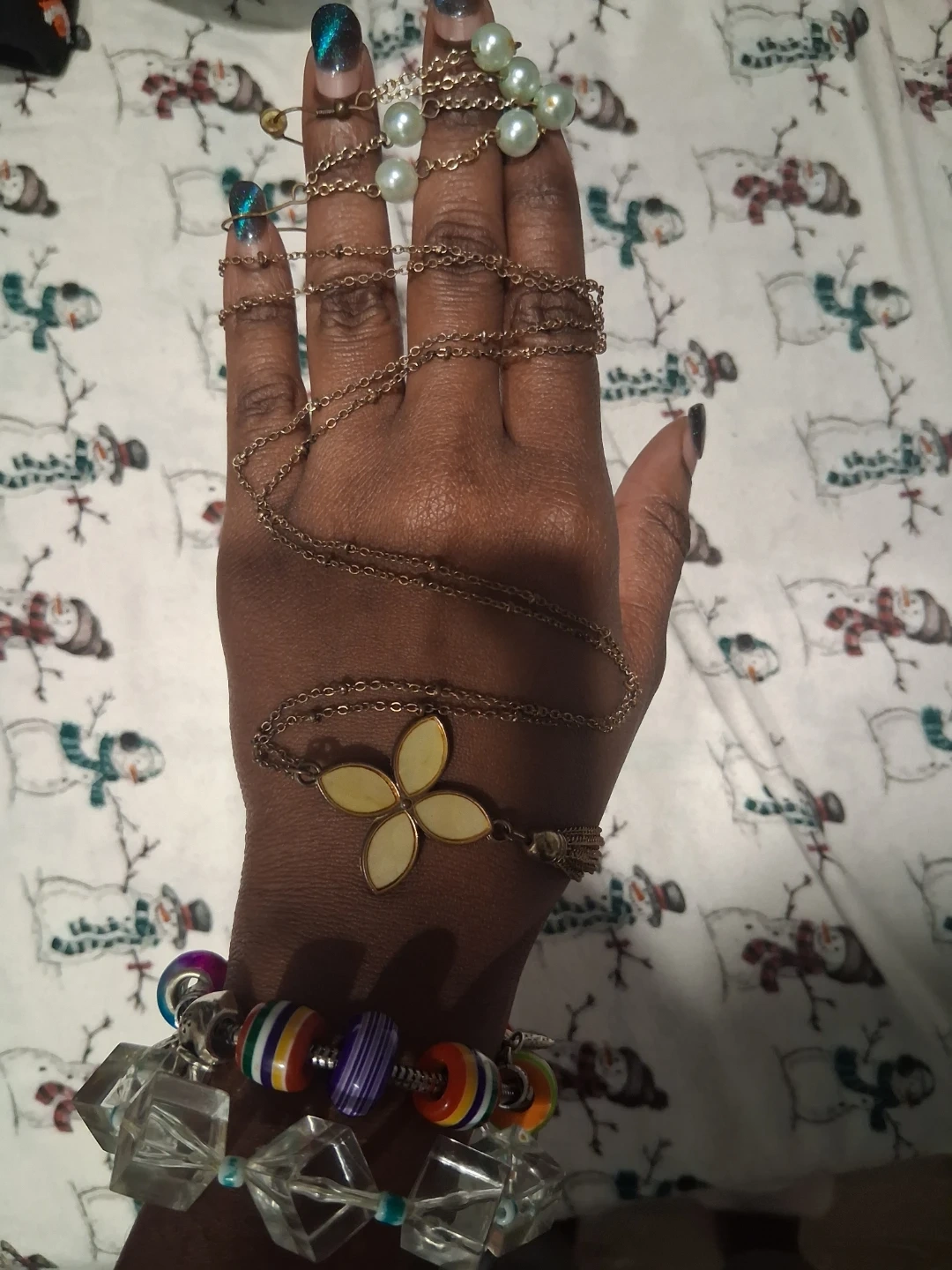 This set includes a unique hand chain bracelet with a floral charm and pearl accents. It also features a separate colourful beaded bracelet with clear crystal and two clear blue earrings and a necklace.