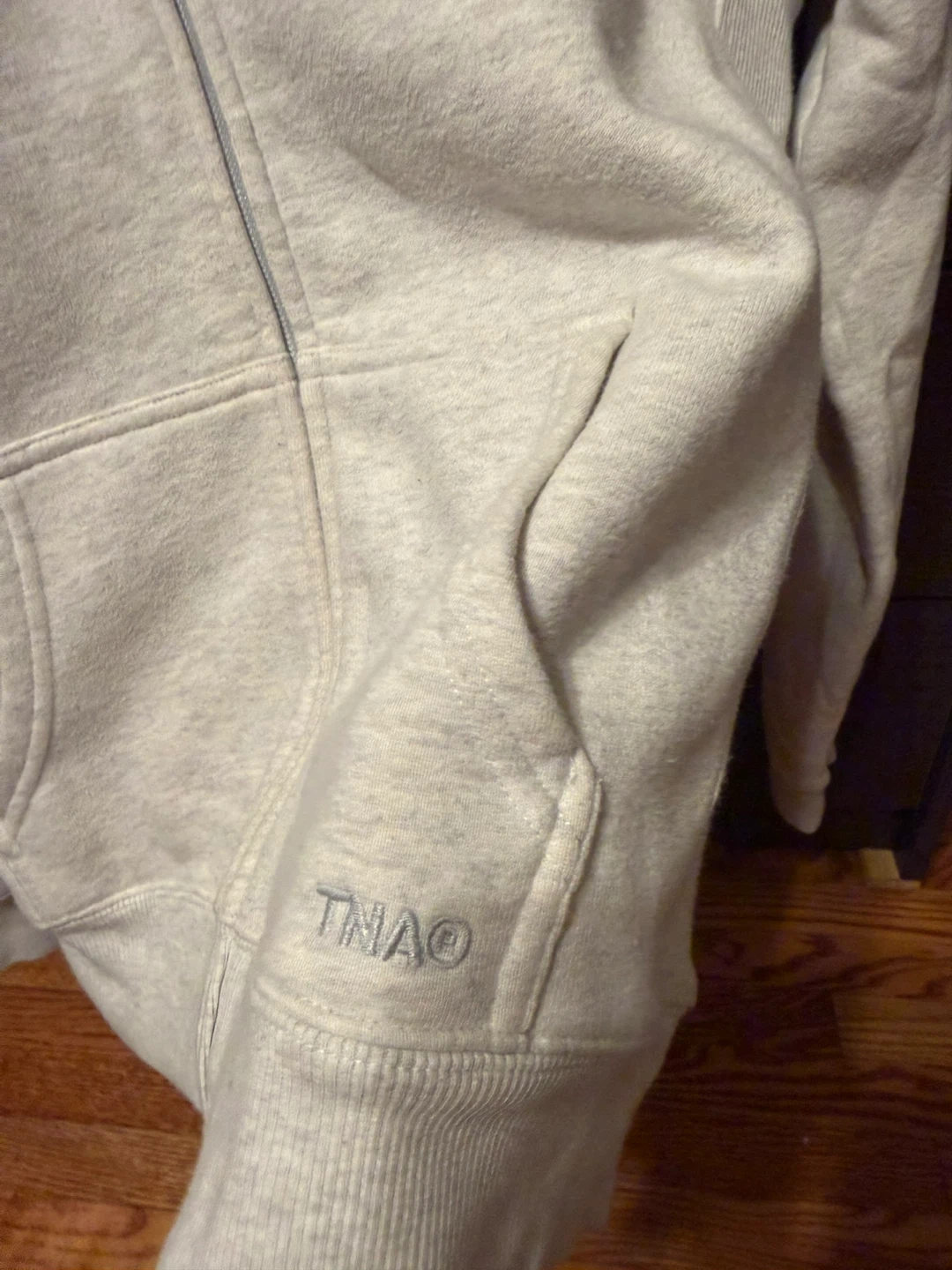 This is a TNA Cozy Fleece zip-up hoodie. It's made with a comfortable sweatfleece material. The size is Large and it comes in a snug fit.