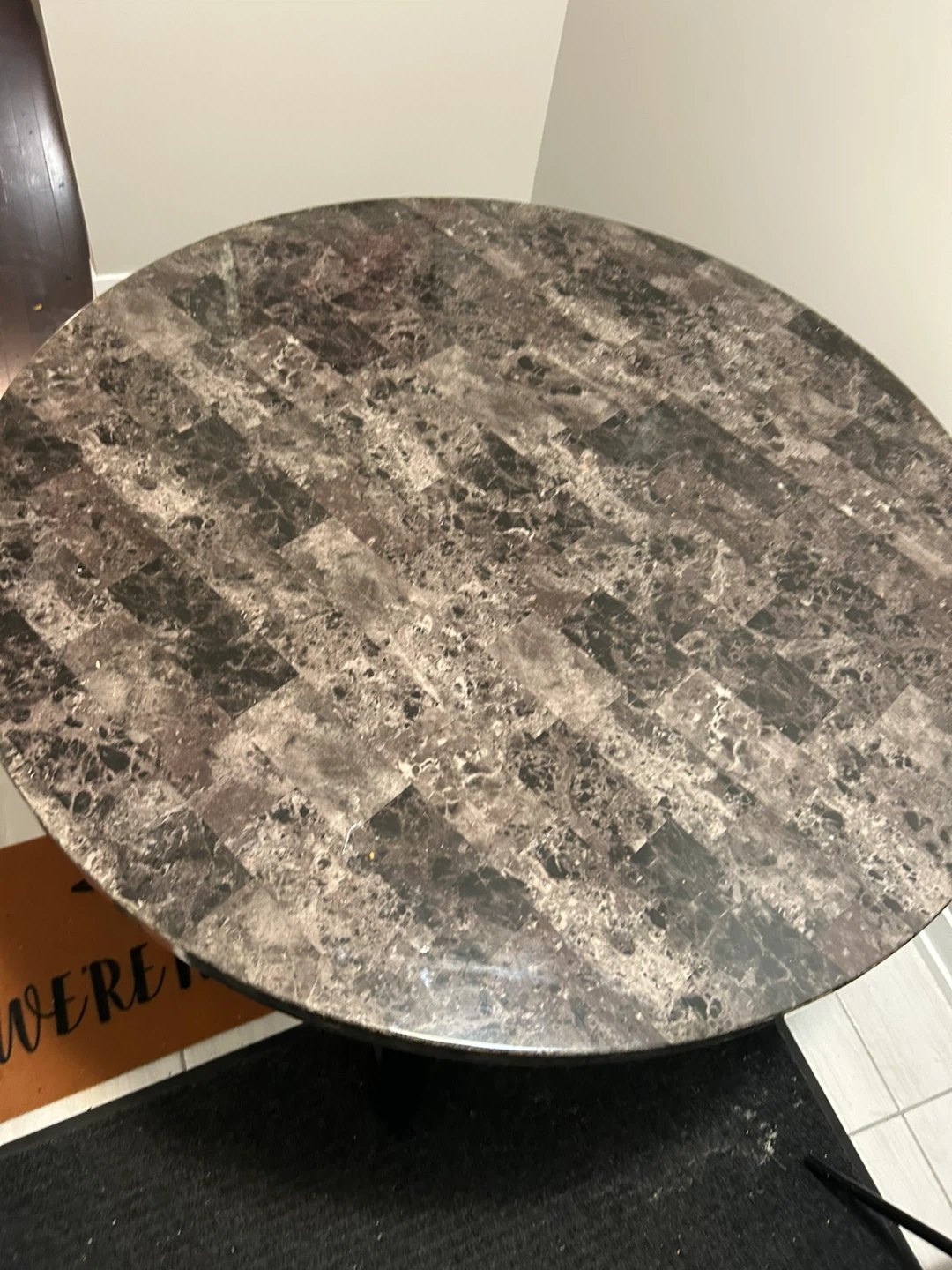 Selling a round table with a marble pattern top. It's in good condition and would be a great addition to any dining space or kitchen. The table has a unique design that adds a touch of elegance to your home