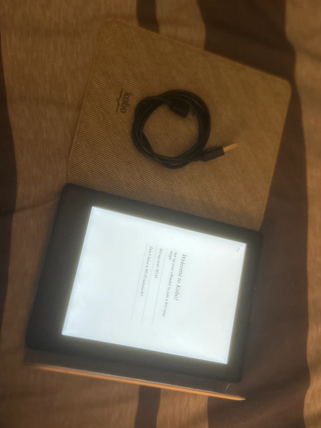 Kobo eReader. It comes with a protective case and a charging cable. The device is ready for setup. It's a great way to carry your books digitally.