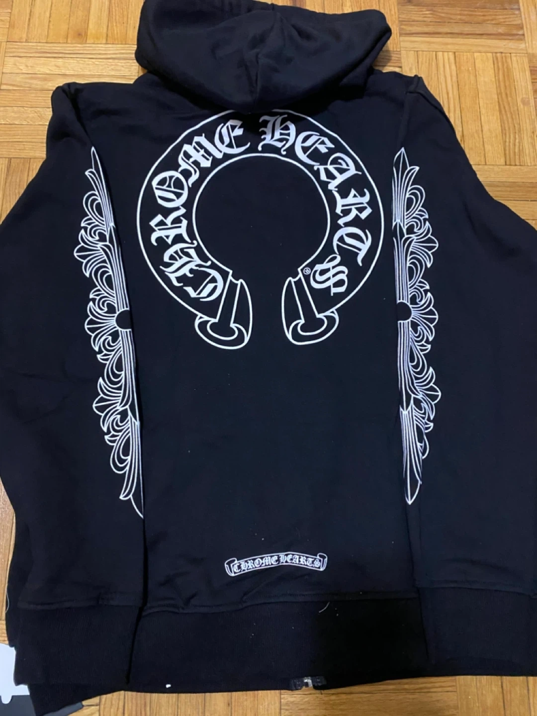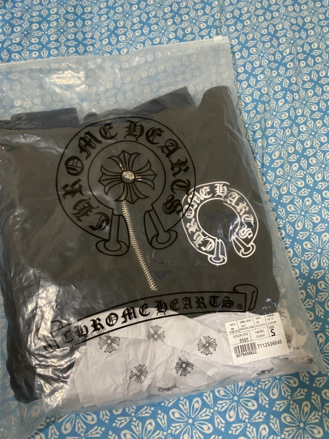 This is a black Chrome Hearts zip-up hoodie featuring the iconic horseshoe logo on the back and sleeve detailing. It's made from a comfortable fabric and comes in size S. The hoodie is still in its original packaging, ready to wear!