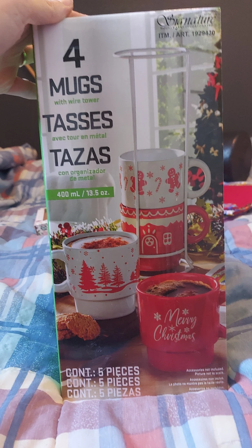 This set includes 4 mugs with a convenient wire tower for storage. Each mug has a 400 mL capacity. They're great for enjoying warm beverages during the holiday season!