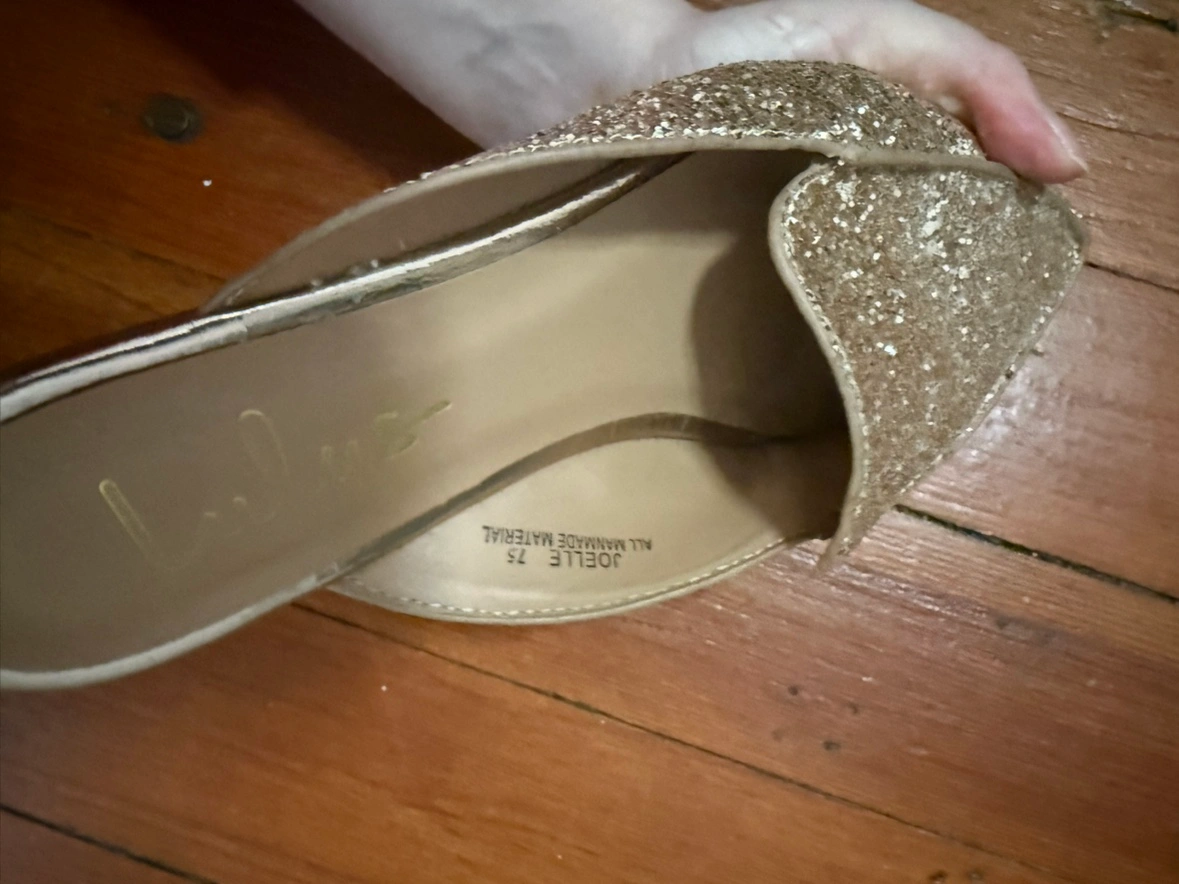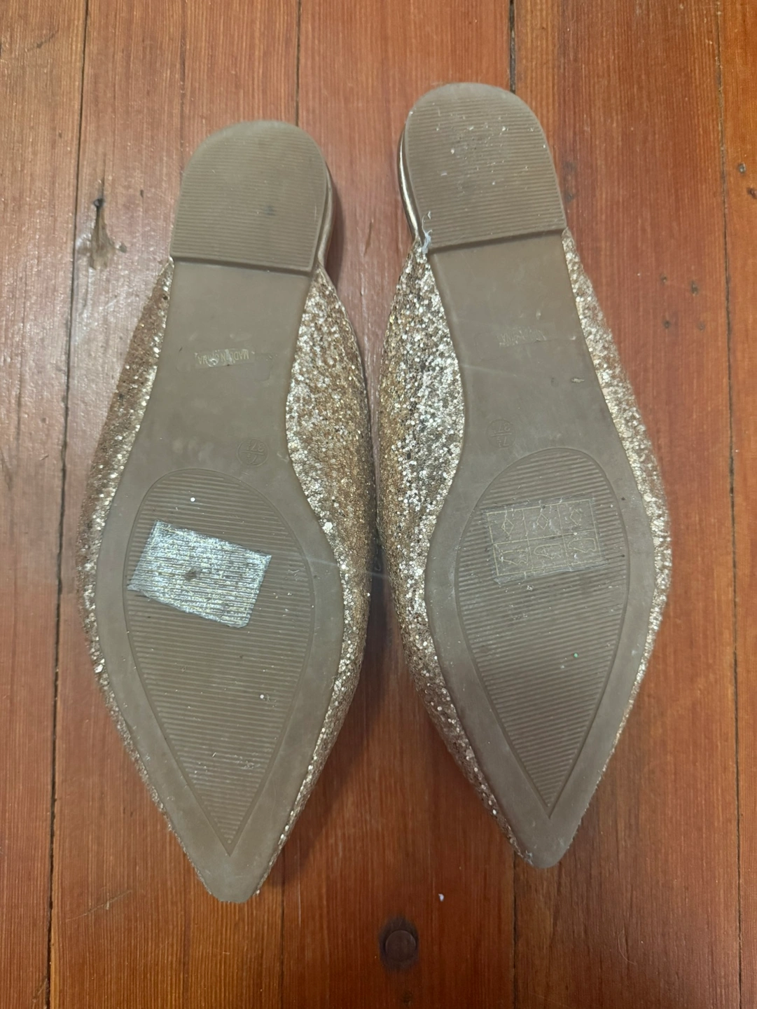 Sparkly Lulus mules covered in rose gold glitter. These pointed-toe flats feature a slip-on design. They're a size 7.5. I wore them once to a wedding and never again, though they have been in storage for years.