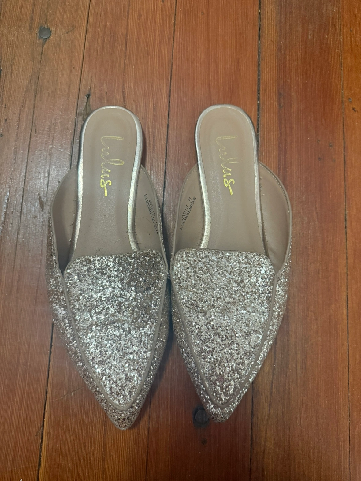Sparkly Lulus mules covered in rose gold glitter. These pointed-toe flats feature a slip-on design. They're a size 7.5. I wore them once to a wedding and never again, though they have been in storage for years.