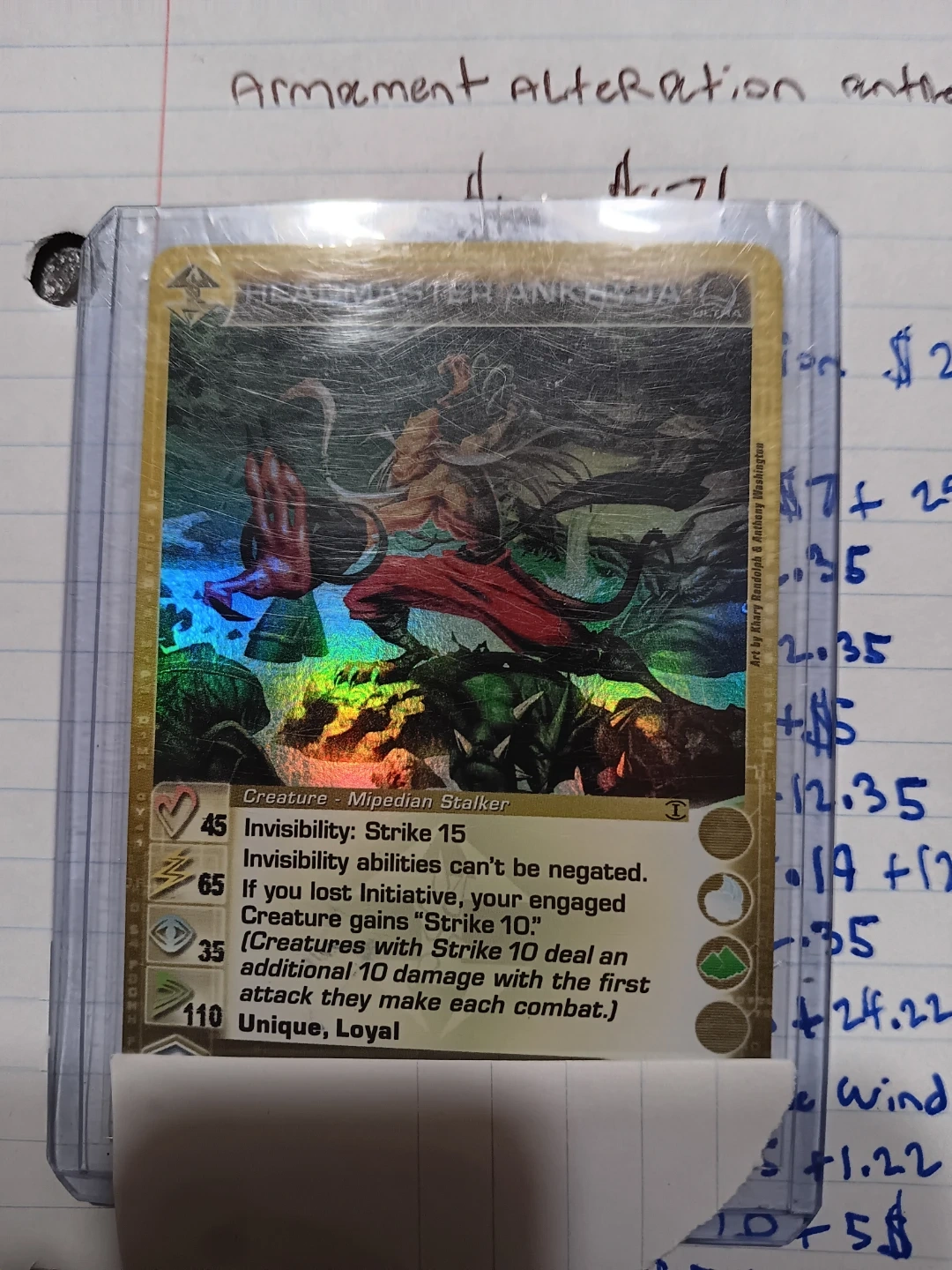 This is a Chaotic Invasion Mipetian Stalker trading card. It's a creature card with Strike 15 and Invisibility abilities. The card is unique and loyal.