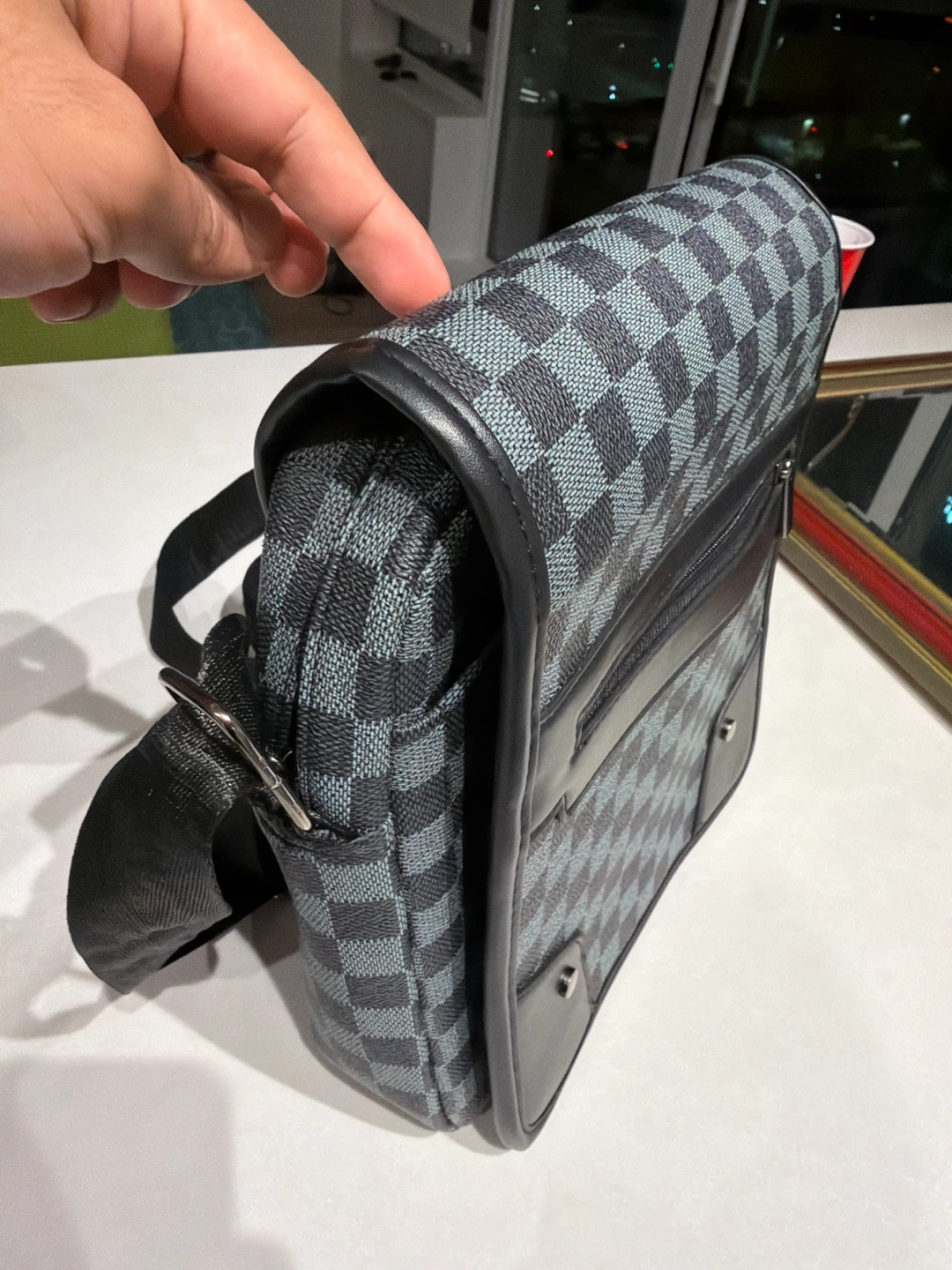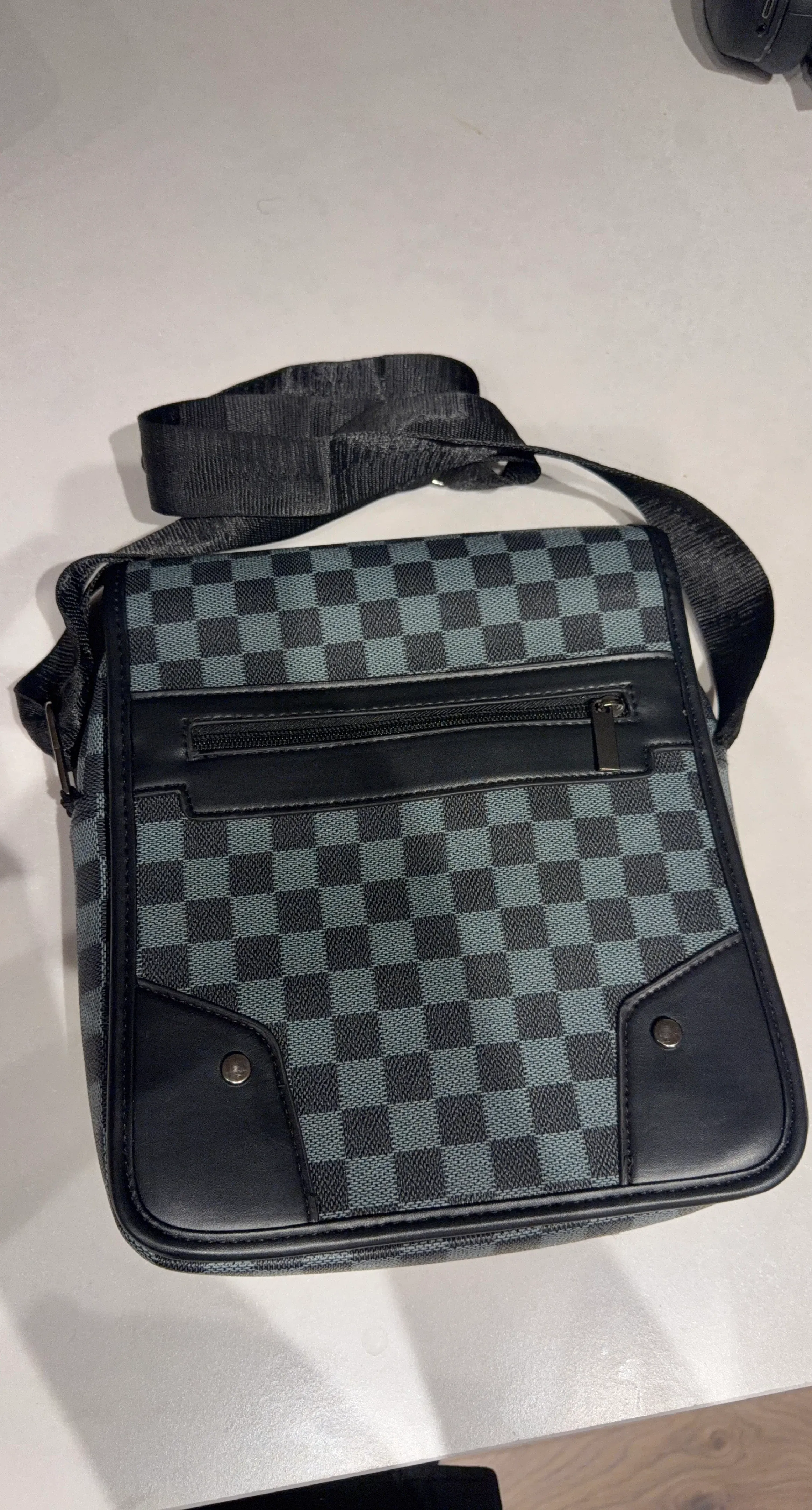 This men's crossbody bag features a classic checkered pattern. It has multiple compartments for organization. Adjustable shoulder strap included.