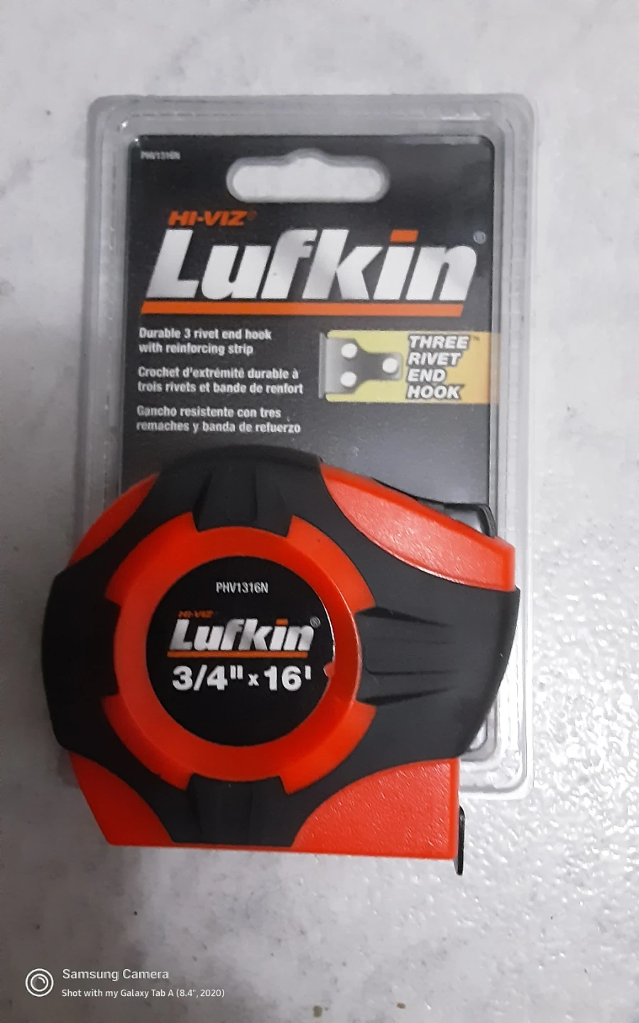 This is a Lufkin Hi-Viz tape measure. It features a durable 3 rivet end hook with reinforcing strip. The case is designed to fit comfortably in your hand. This tool is useful for measuring tasks around the house or on the job.