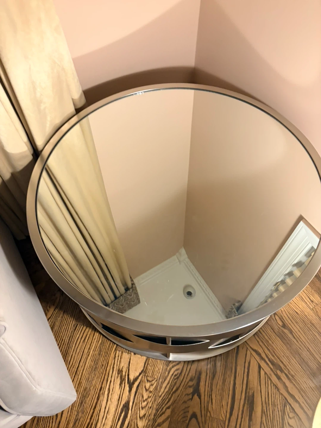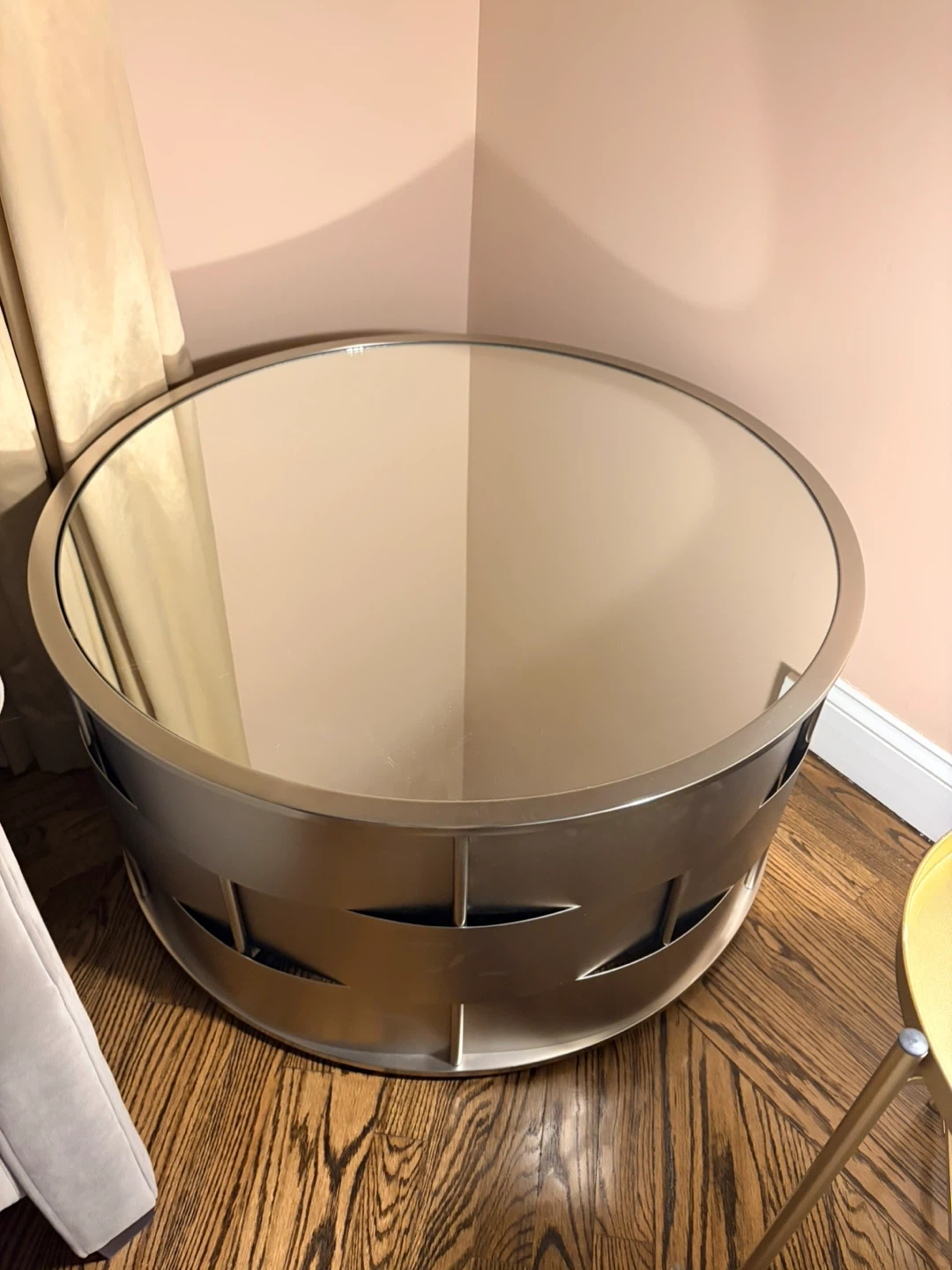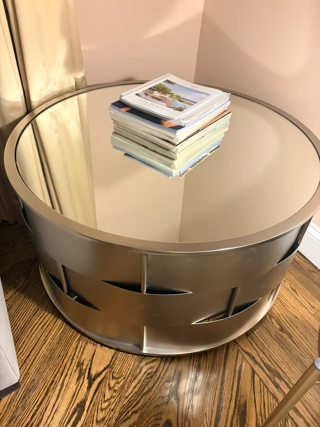This round coffee table features a mirrored top and a decorative metal base. It's a stylish addition to any living space. The metal base has an open, woven design.