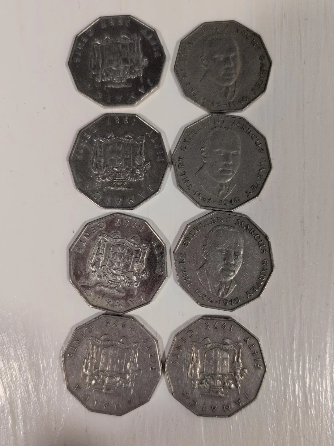 This lot includes 8 x 50 cent, 2 x 10 cent, and 11 x 5 cent Jamaican coins. Also included are 8 x 20 cent coins and 1 x 20 cent coin, for a total of 30 coins. Dates range from 1975 to 2006. They feature the Jamaican coat of arms and Marcus Garvey.