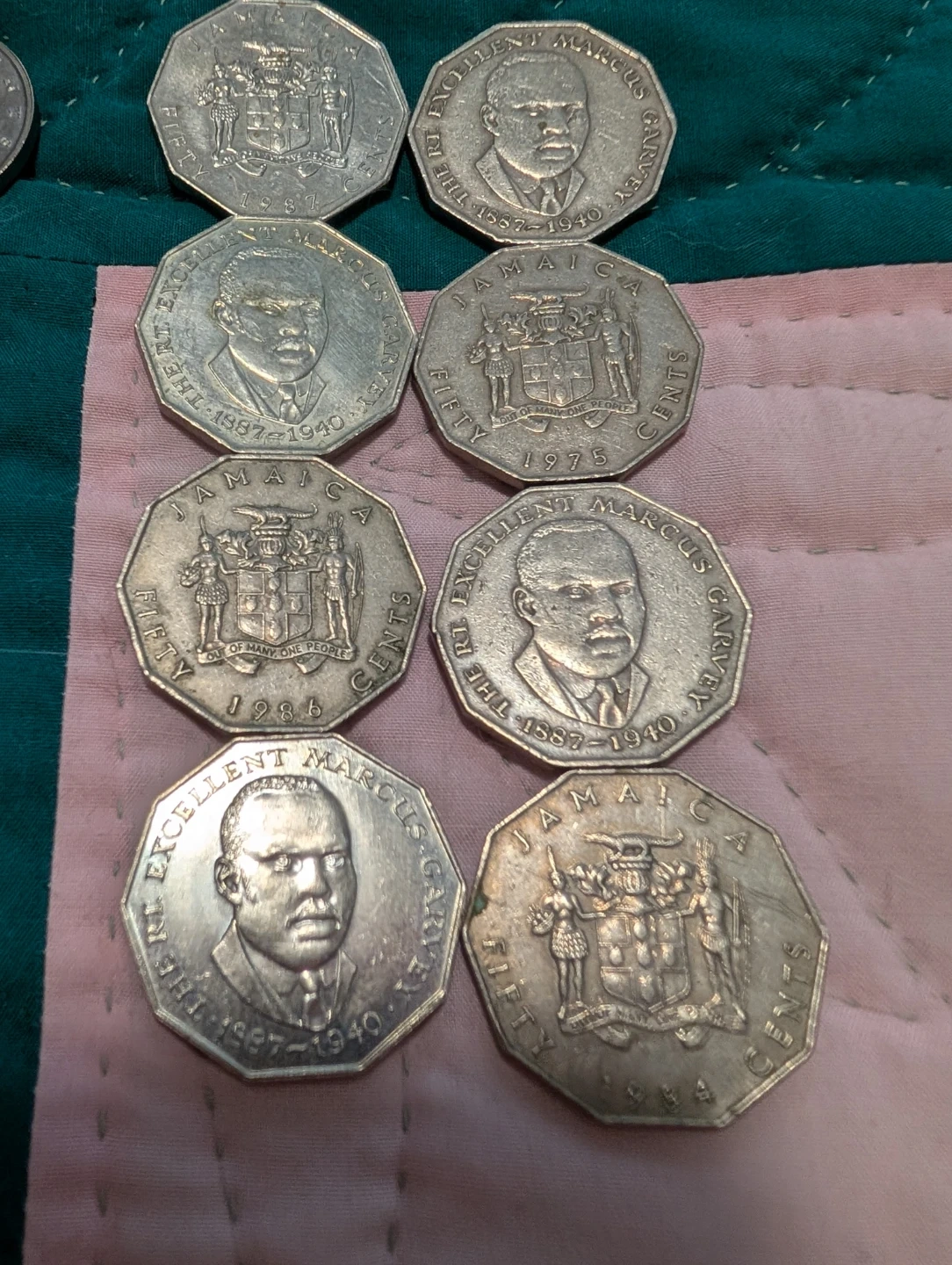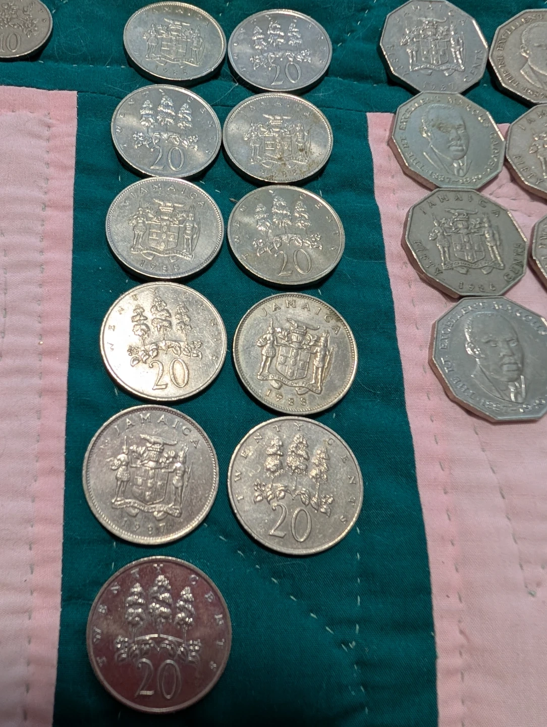 This lot includes 8 x 50 cent, 2 x 10 cent, and 11 x 5 cent Jamaican coins. Also included are 8 x 20 cent coins and 1 x 20 cent coin, for a total of 30 coins. Dates range from 1975 to 2006. They feature the Jamaican coat of arms and Marcus Garvey.