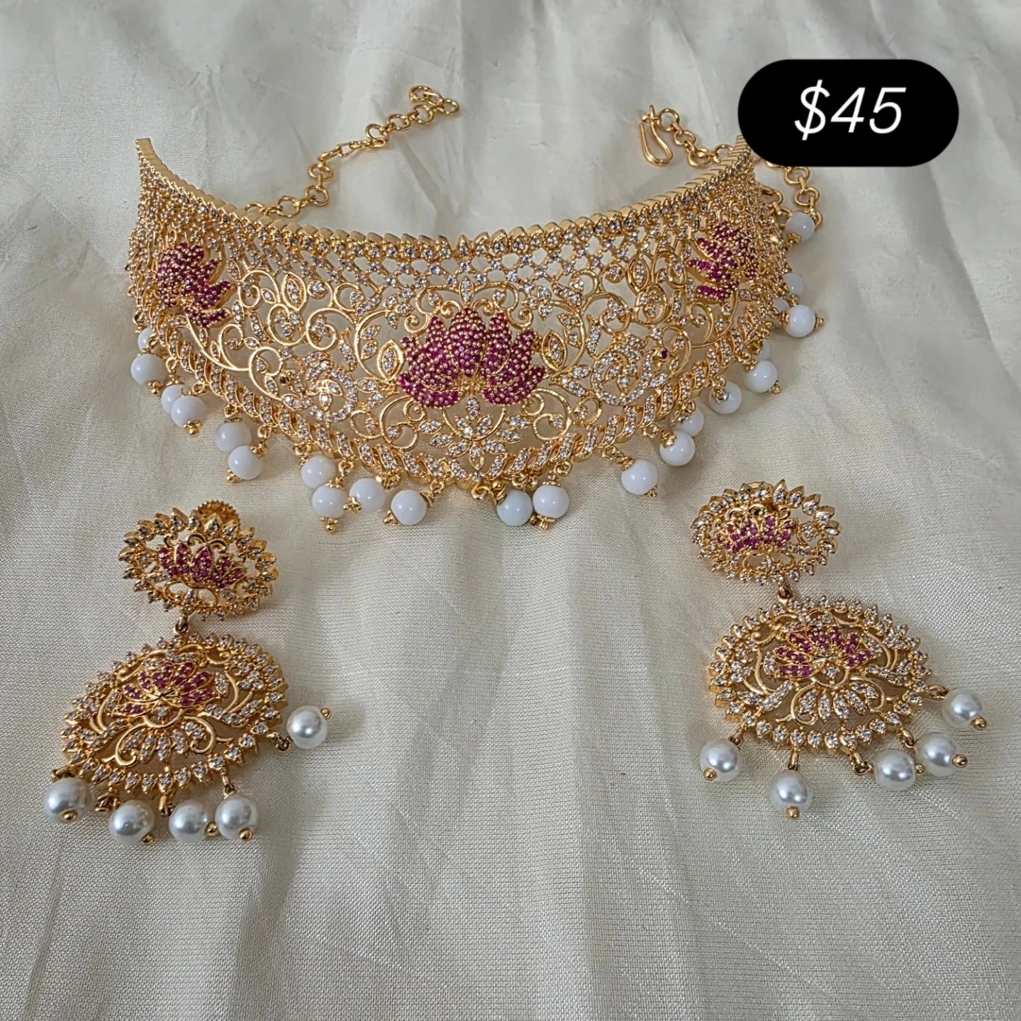 Beautiful gold-toned choker necklace and matching earrings set. Features intricate detailing with clear and pink stones, accented by dangling white pearls. Perfect for special occasions!