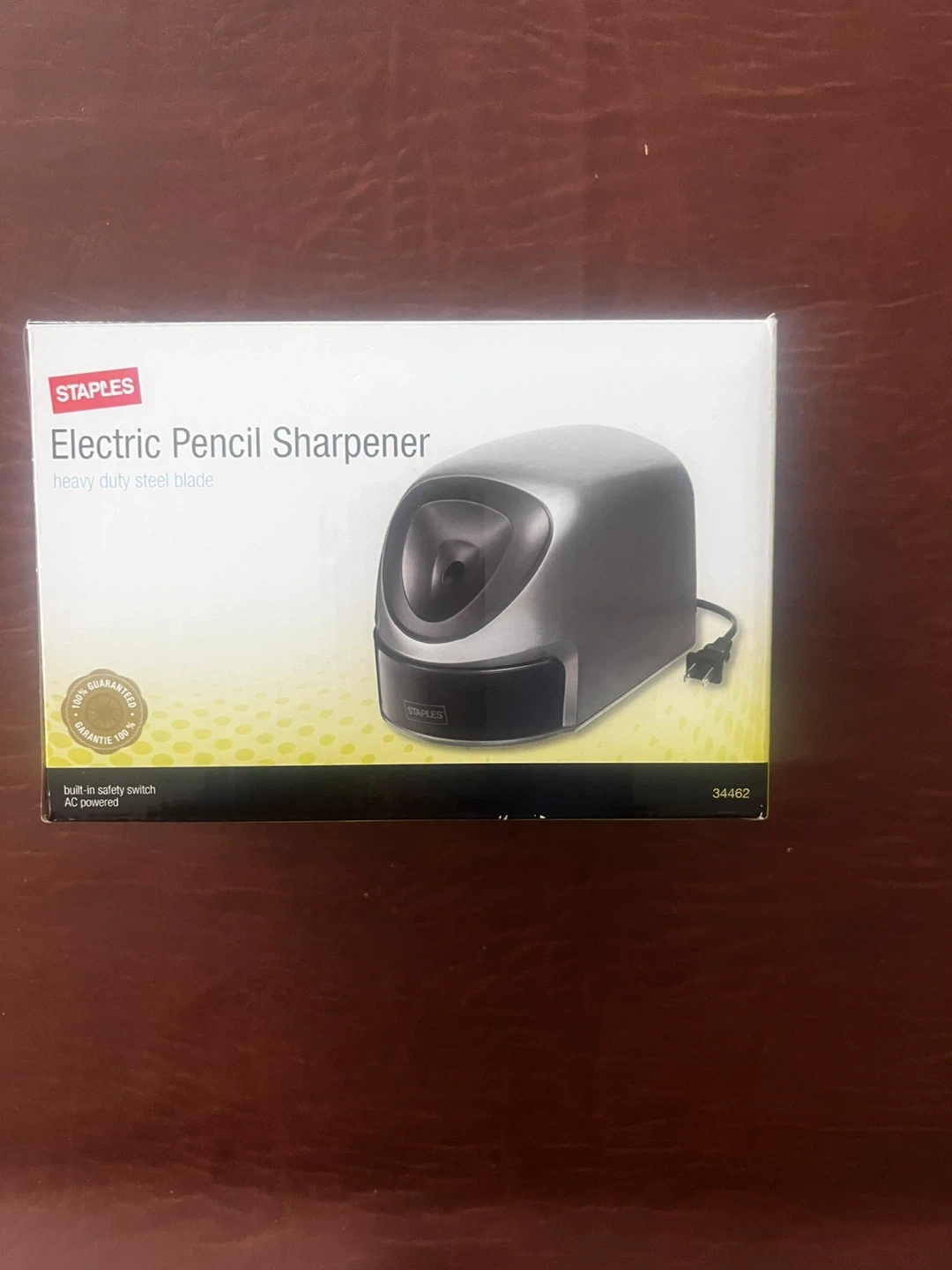 This is a new Staples electric pencil sharpener with a heavy-duty steel blade. It's AC powered and has a built-in safety switch. Never used, in box.