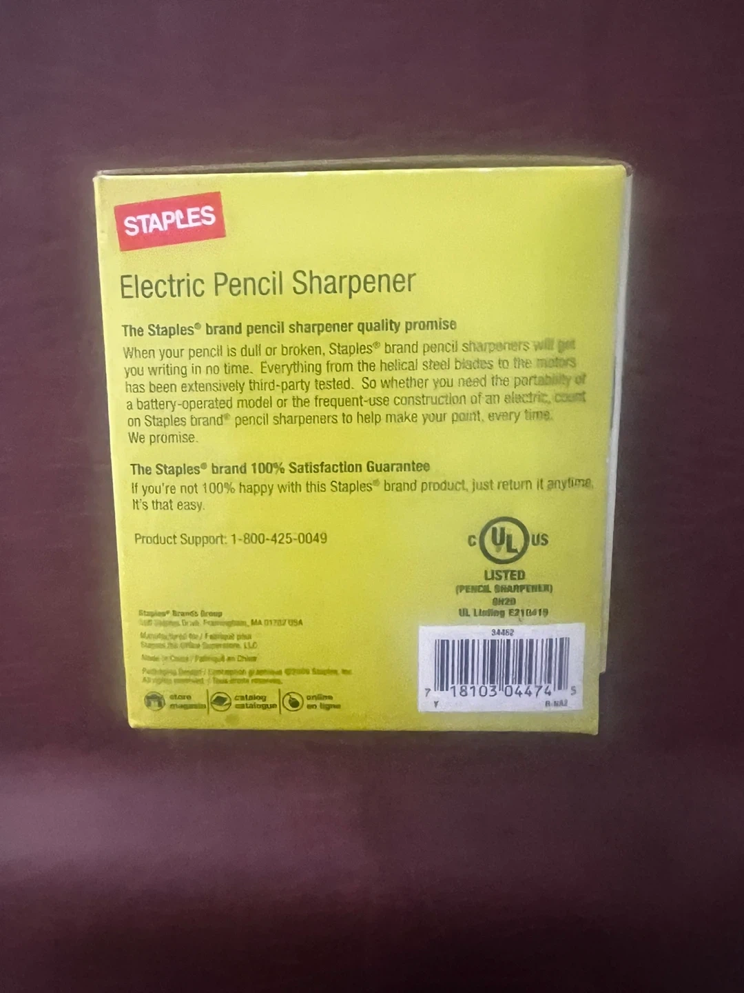 This is a new Staples electric pencil sharpener with a heavy-duty steel blade. It's AC powered and has a built-in safety switch. Never used, in box.