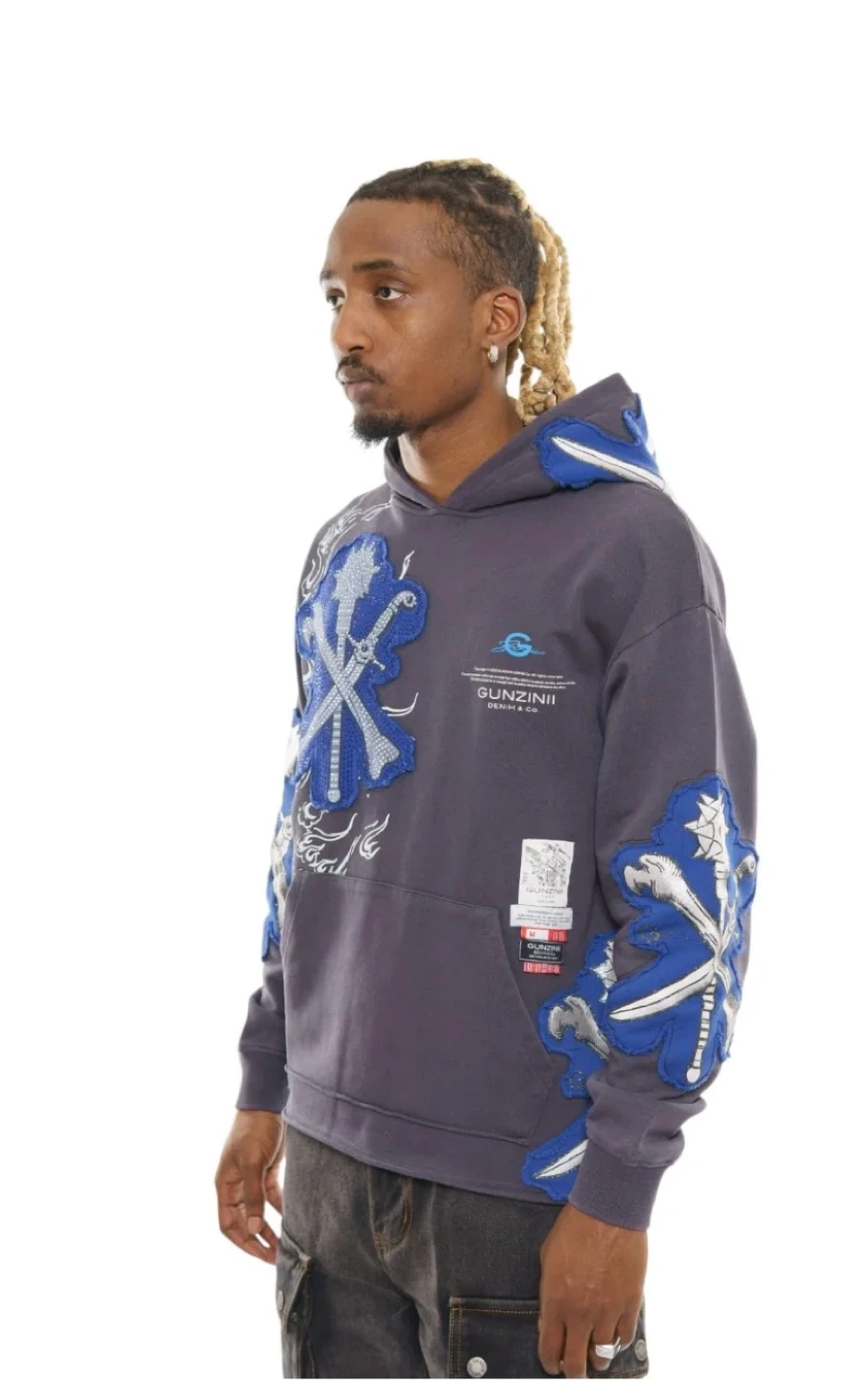 Grey crewneck hoodie with blue and silver graphic appliques on the front, back, and sleeves. It's made of a comfortable material. This hoodie is perfect for casual wear. new with tags