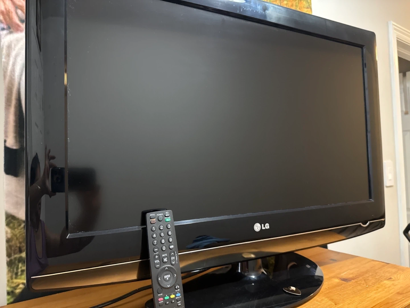 This is a black LG television. It comes with a remote control. It's a great addition to any entertainment setup!