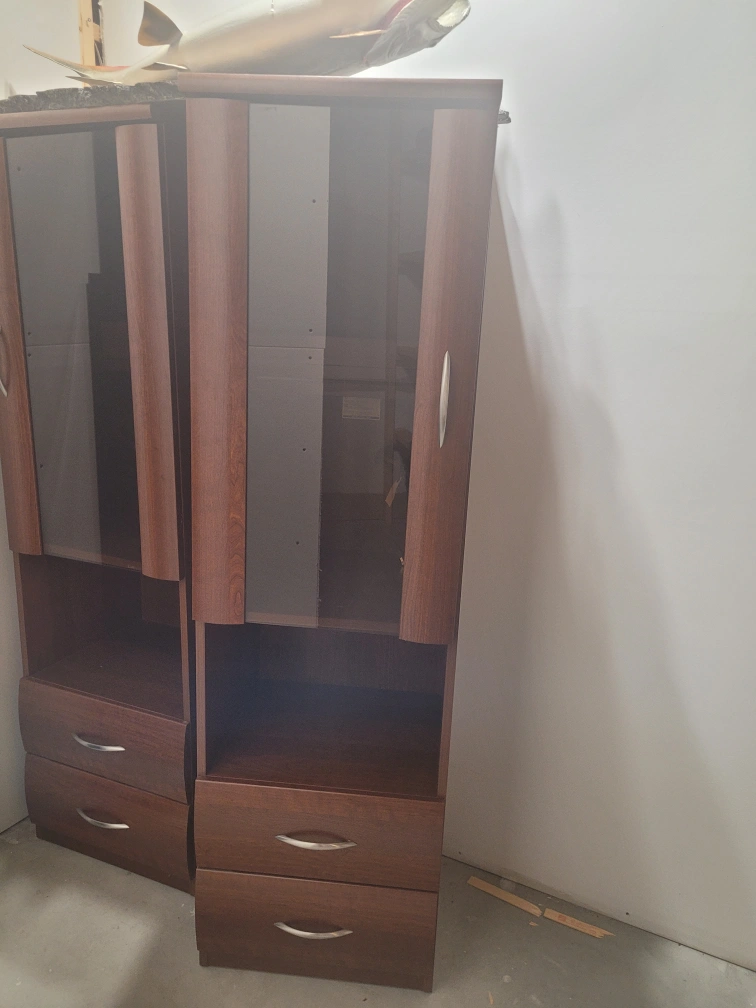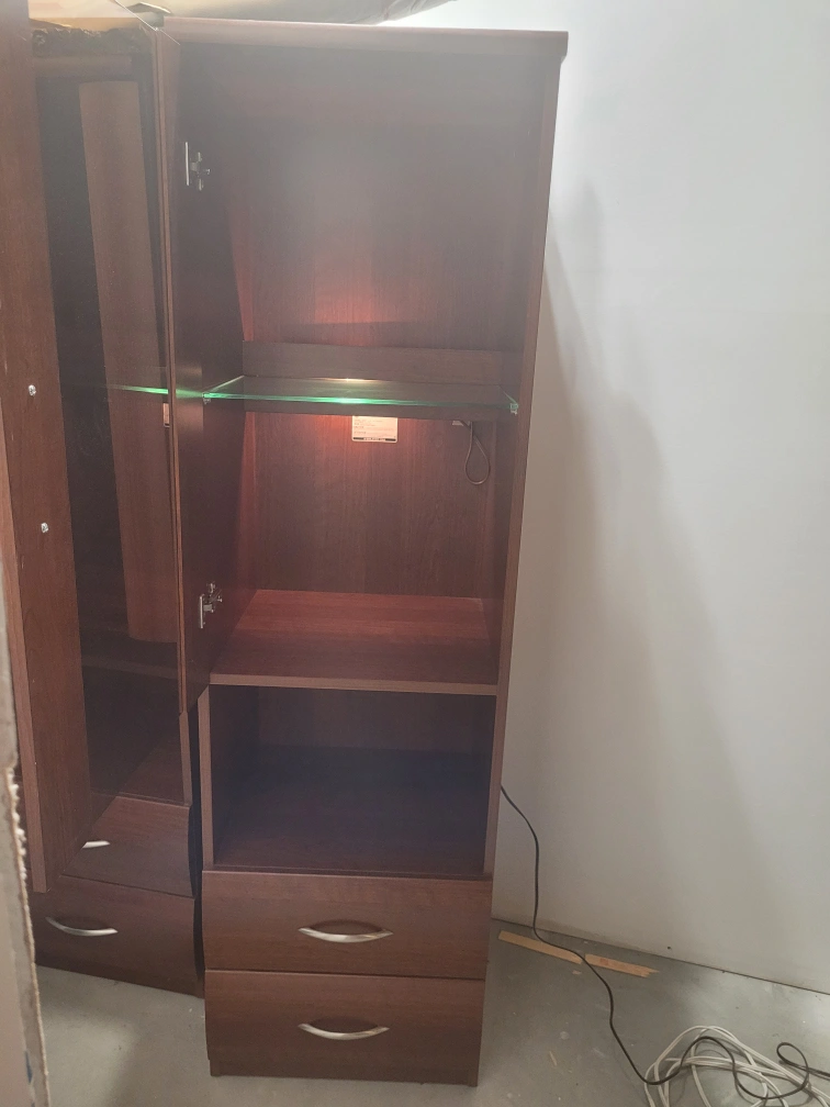 2 Cherrywood color cabinets, both for $70, both have a glass door with a light inside and 2 drawers and a shelf. Can be placed side by side or separately. (cabinets are NOT crooked like it may show, floor is not level and one is pulled out a bit)